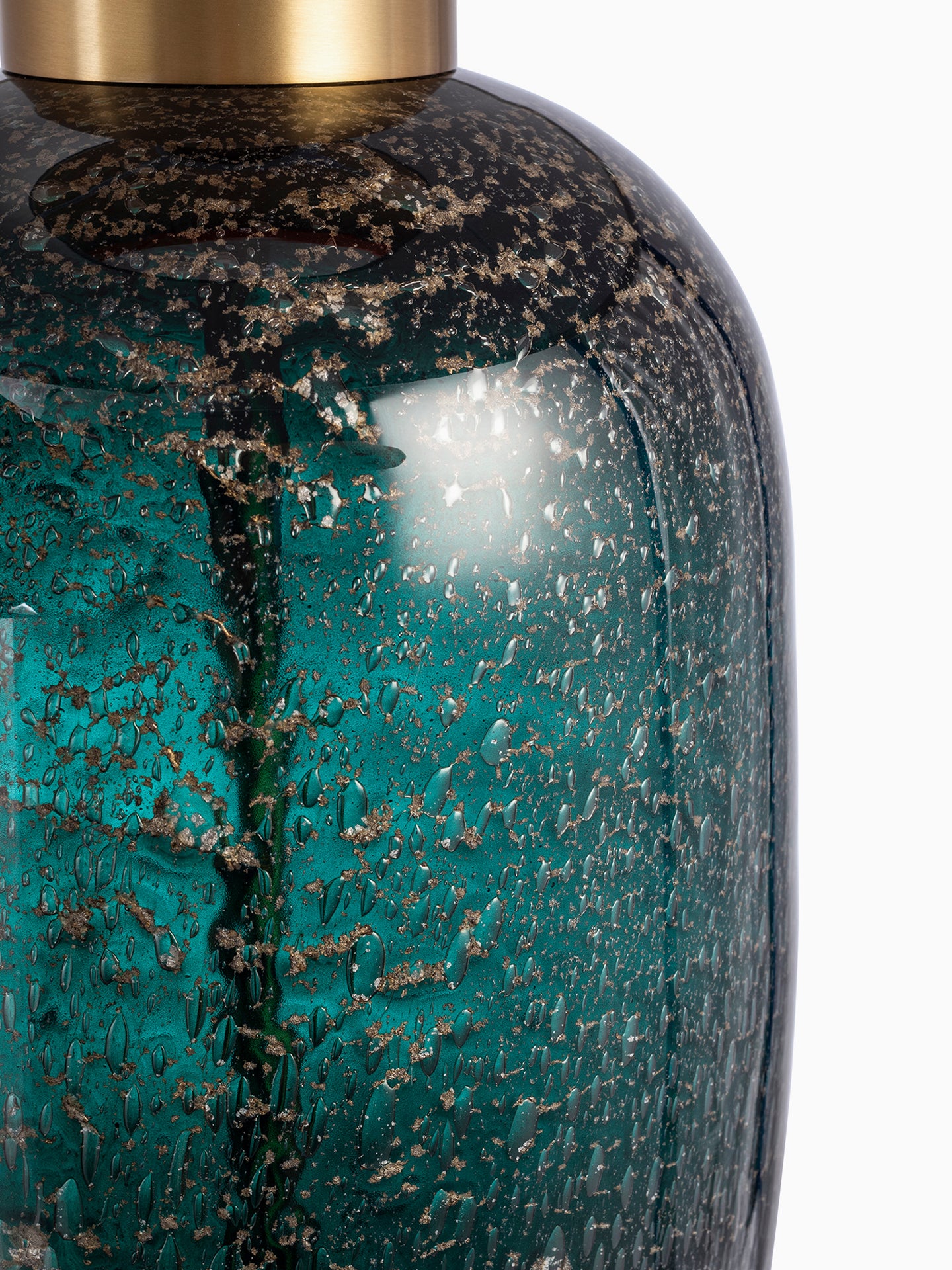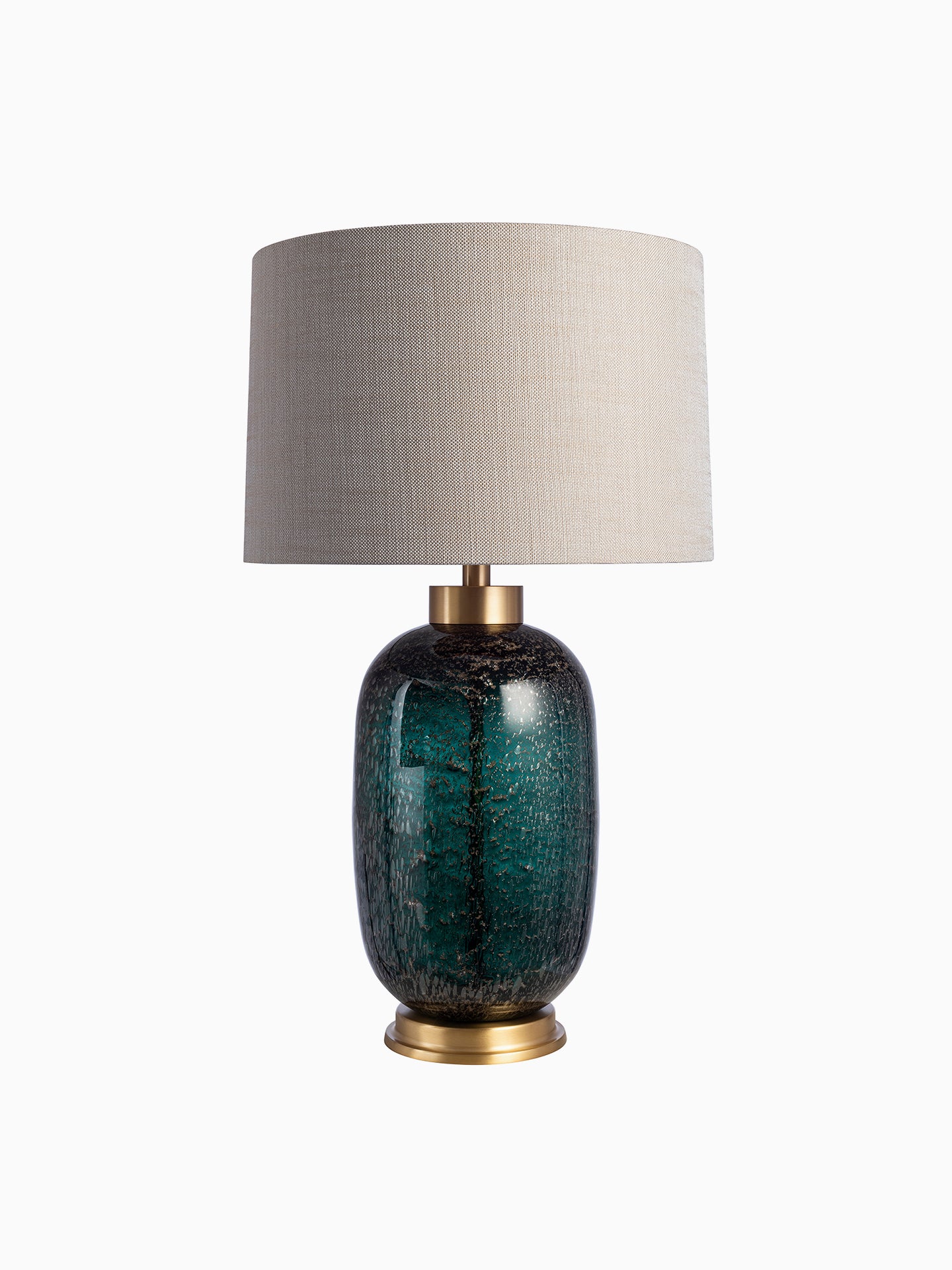Our Amelia Table Lamp is expertly hand-crafted with volcanic frit glass that is complemented with antique brass detailing.