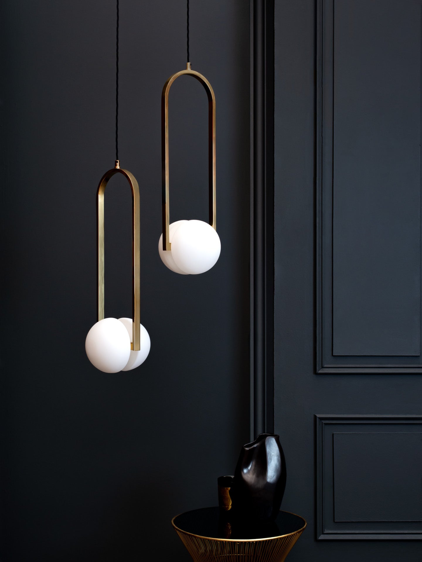 Our Audrey ceiling pendant takes inspiration from the elegance of pearls featured throughout iconic fashion and beauty. This timeless charm is re-interpreted into a beautiful, contemporary form, composed of curved satin brass metalwork and two opal glass hemispheres.