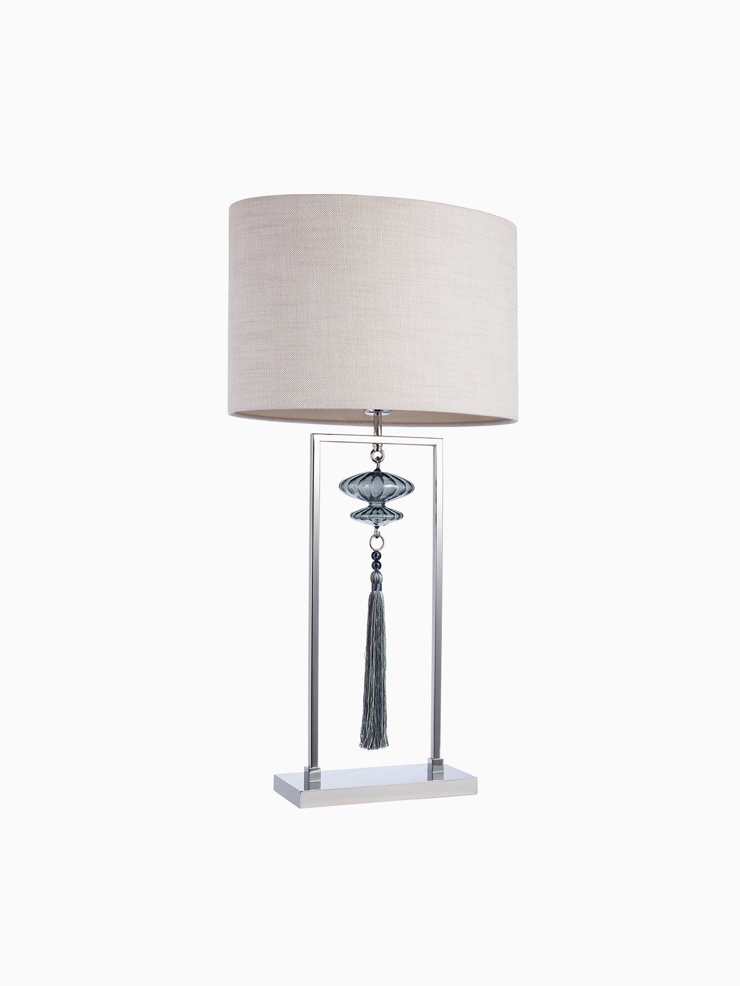 Our Constance range features a simple yet elegant structured metal frame with fluted blown glass and a beaded decorative tassel. Available in table and floor lamp options.