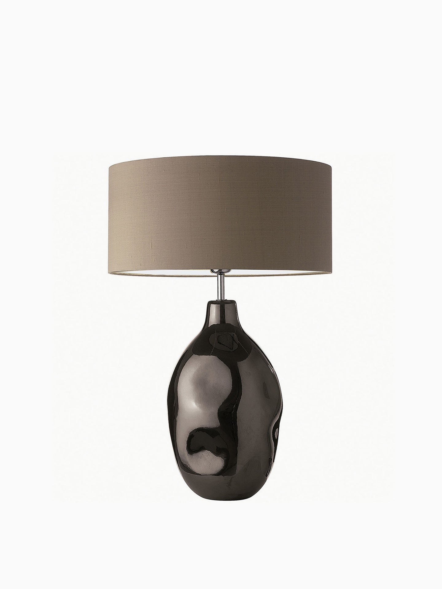 The Cordoba table lamp features a softly rounded ceramic base with a pewter finish and chrome metalwork.