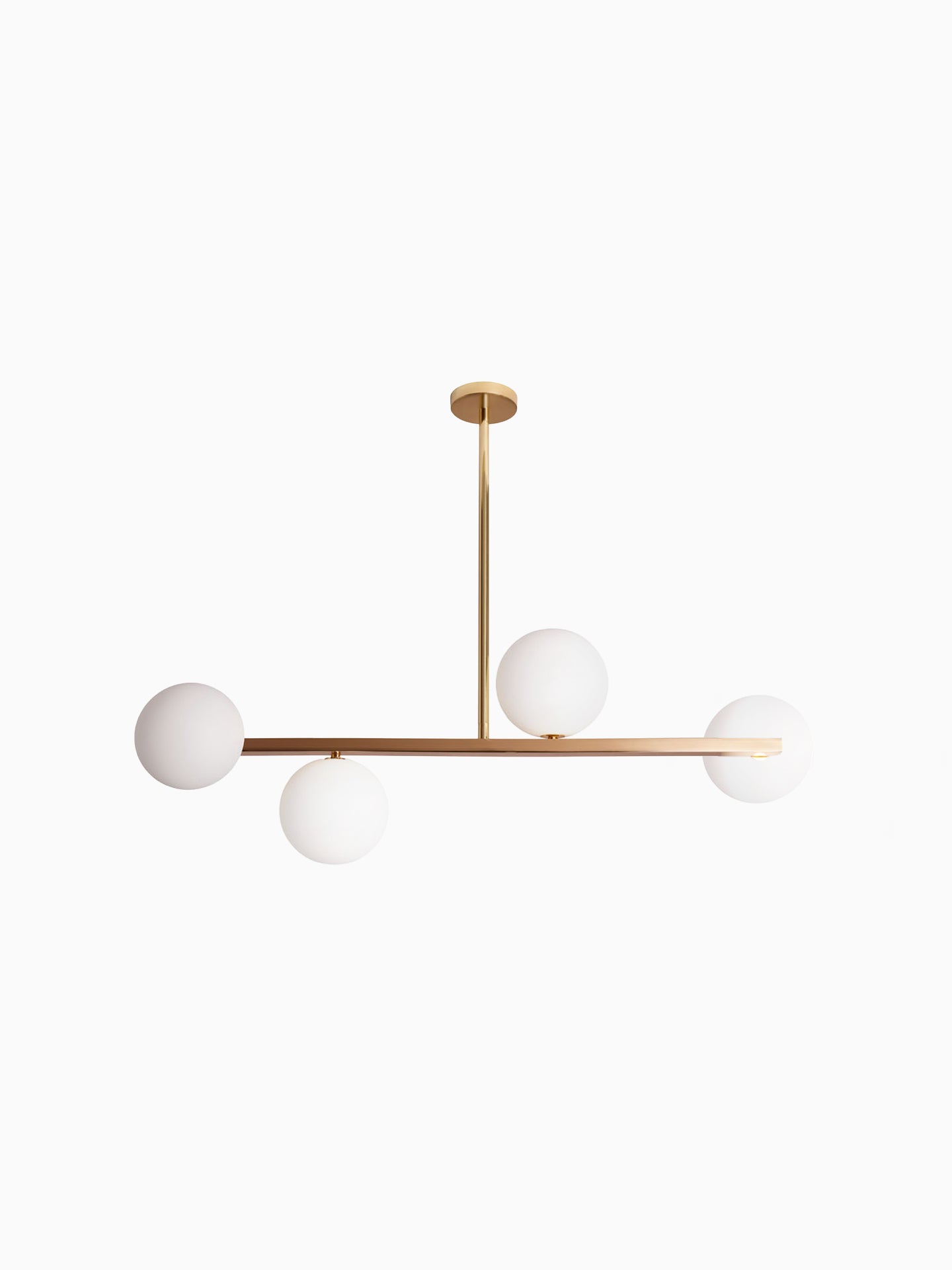 Our popular Gabriella pendant features elegant satin brass metalwork and four opal glass spheres. The asymmetrical positioning creates a fun yet sophisticated feel.