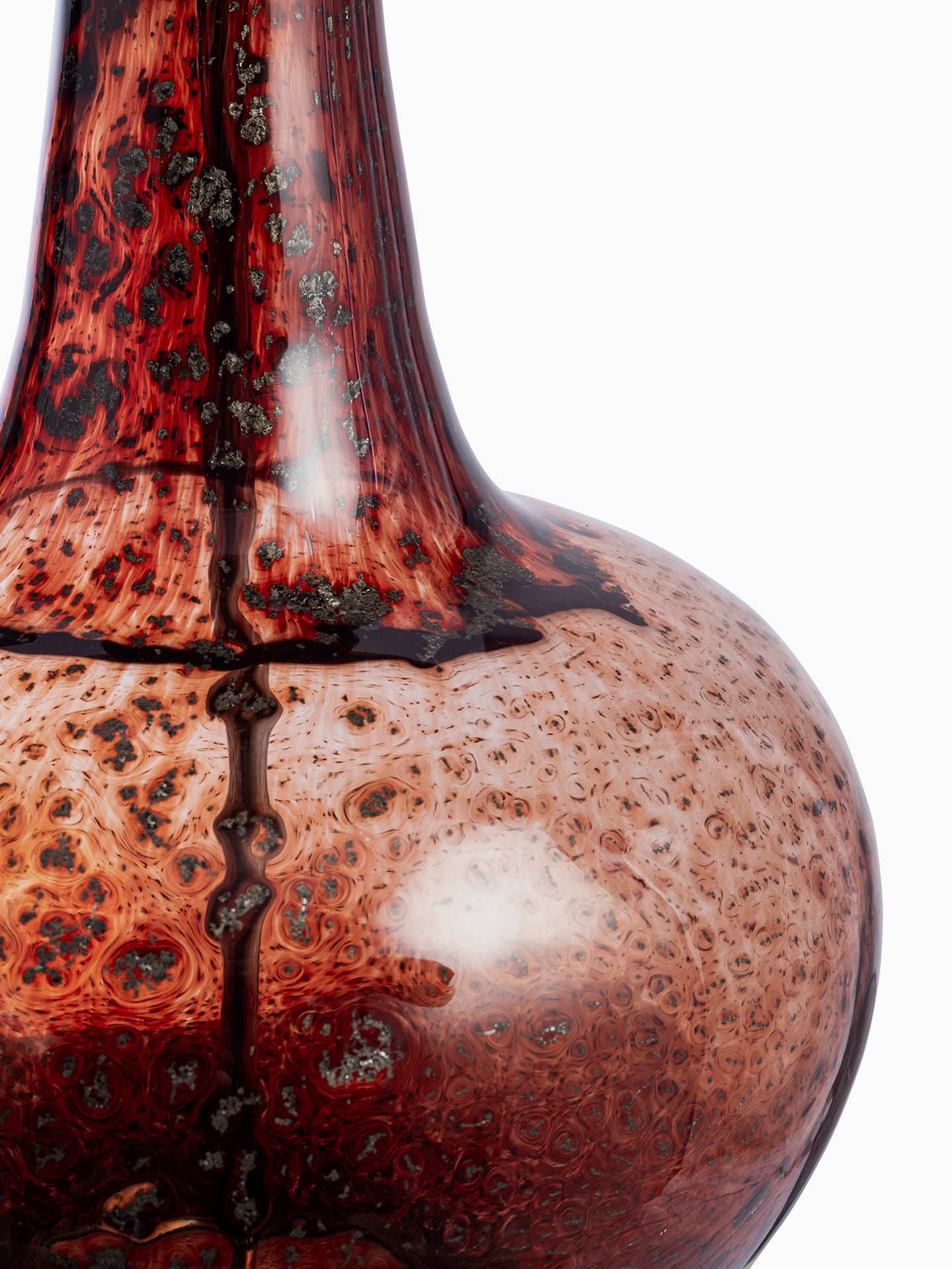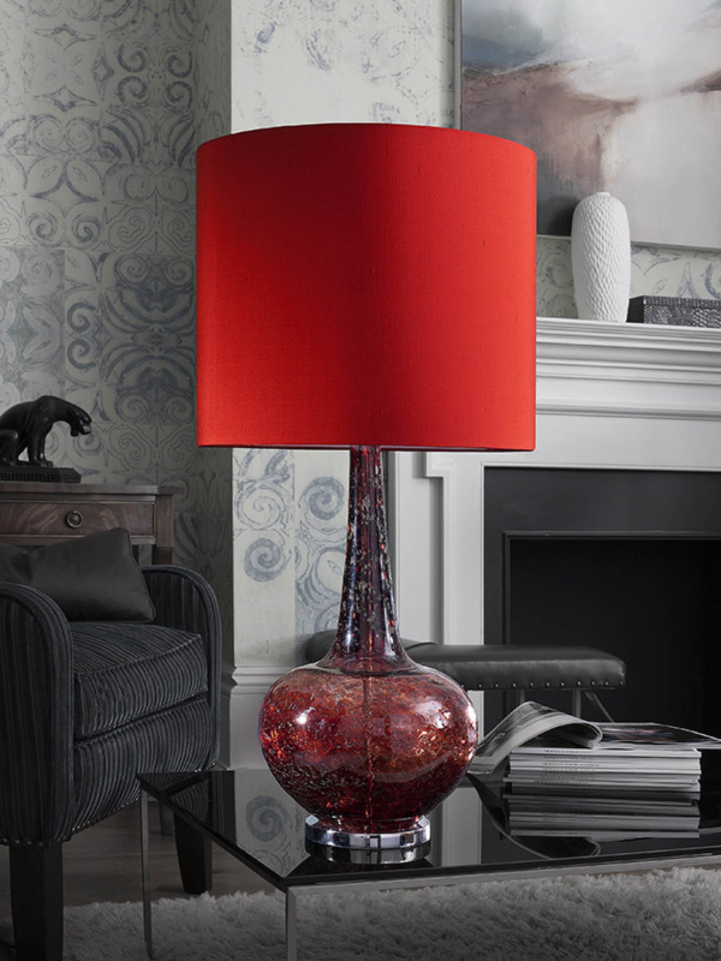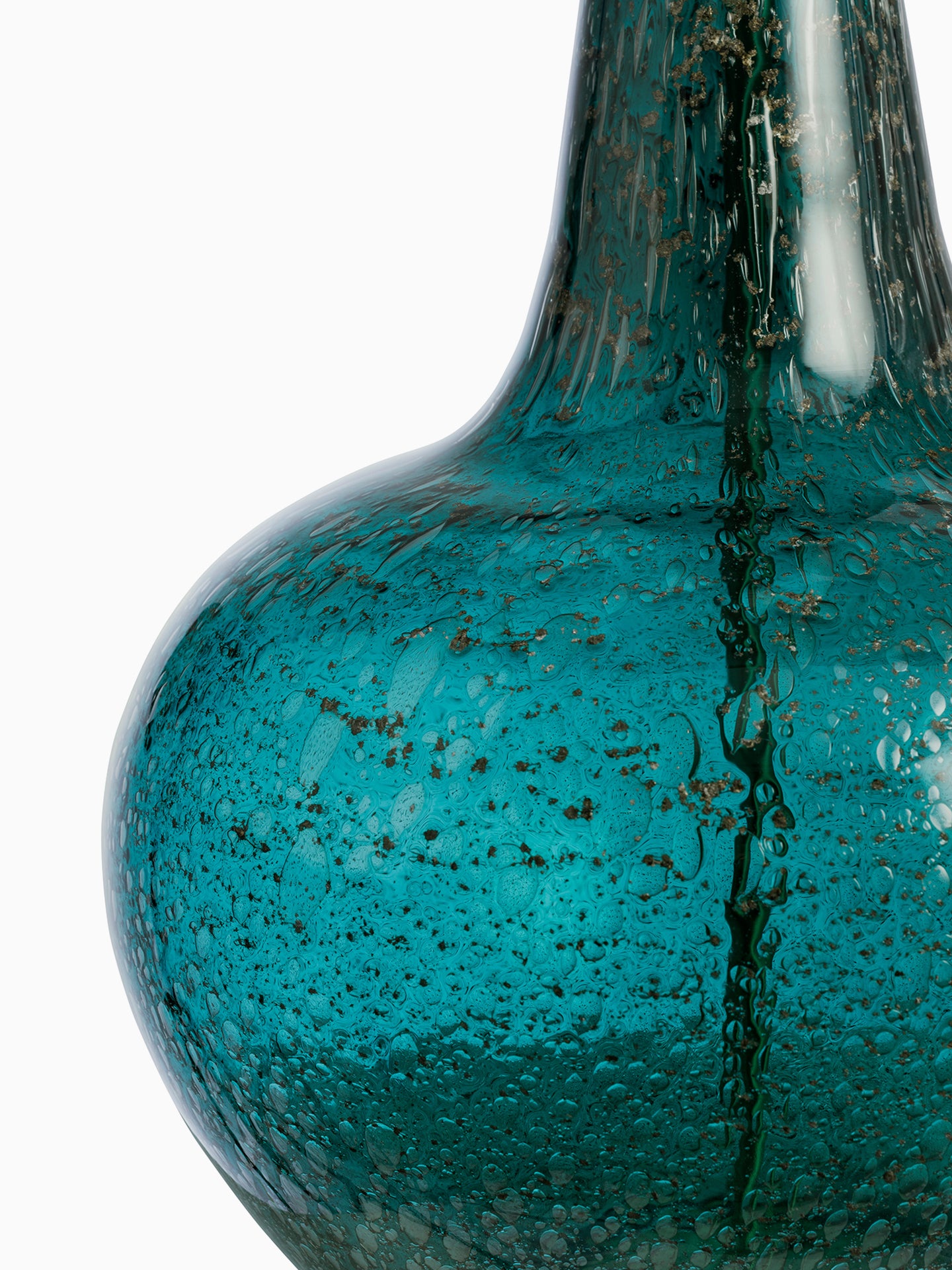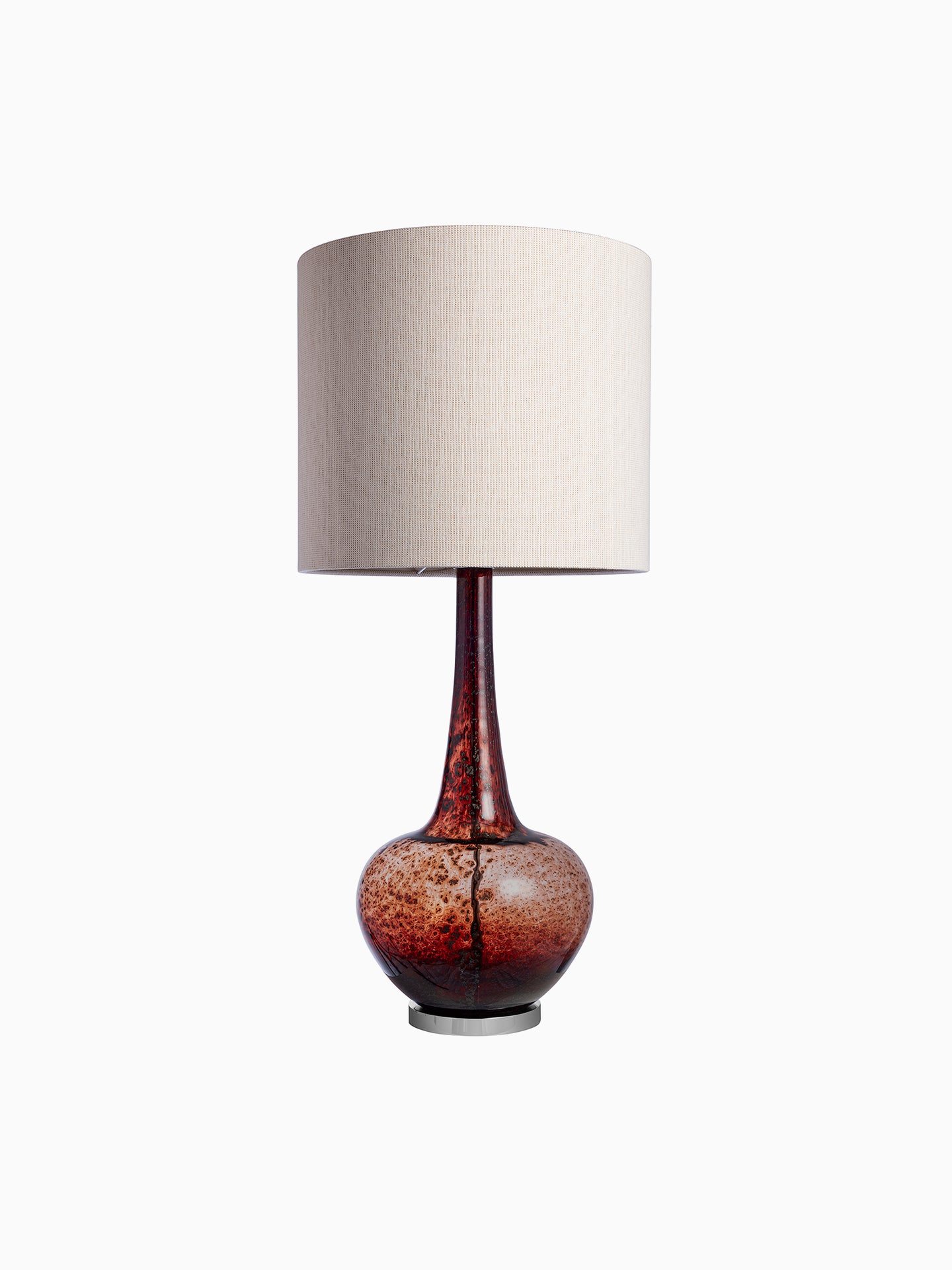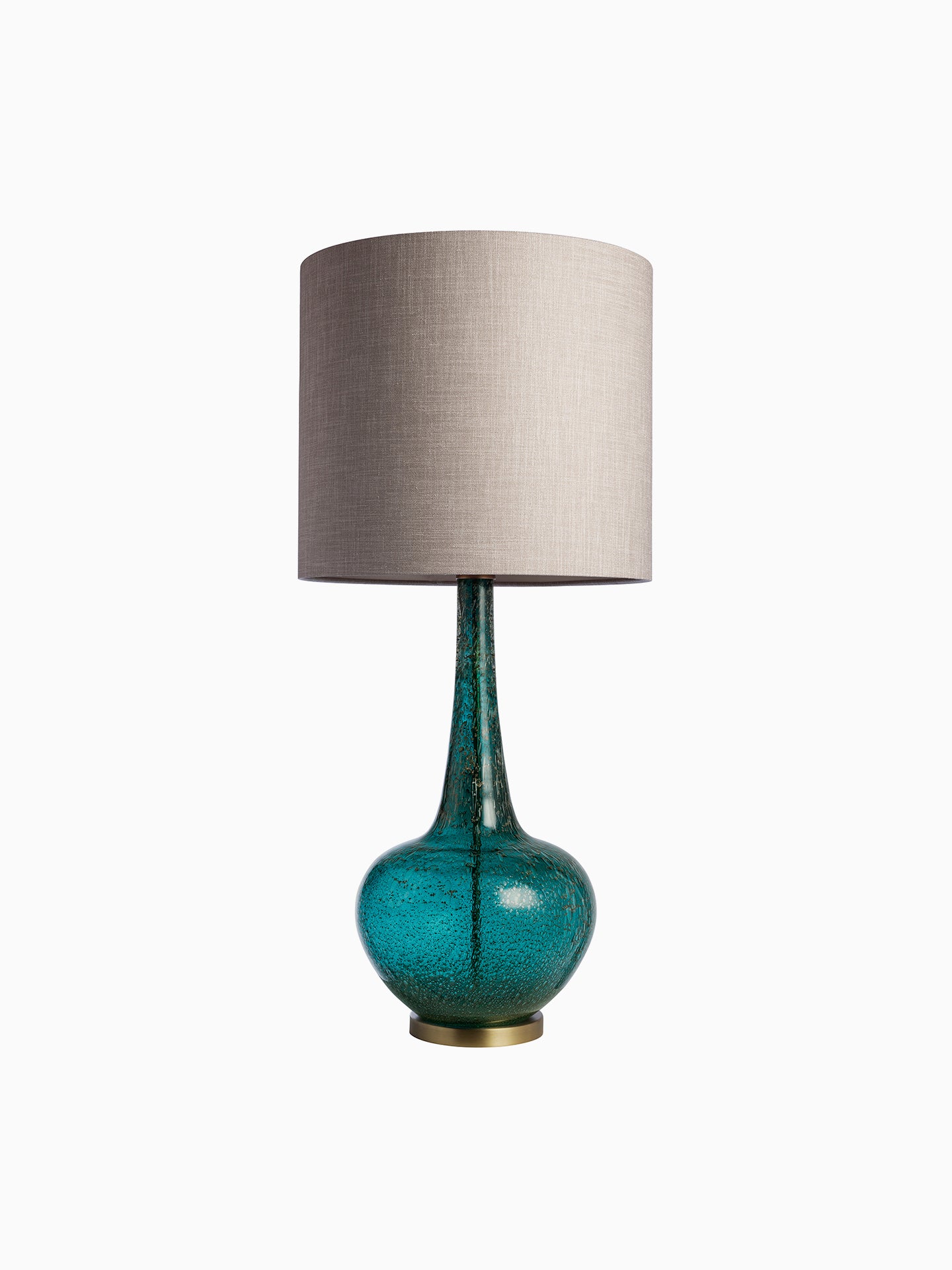 Our Grace table lamp is deeply textured with gold frits and minerals speckled through the surface of the glass. The vibrant piece features a rounded base with an elongated neck.