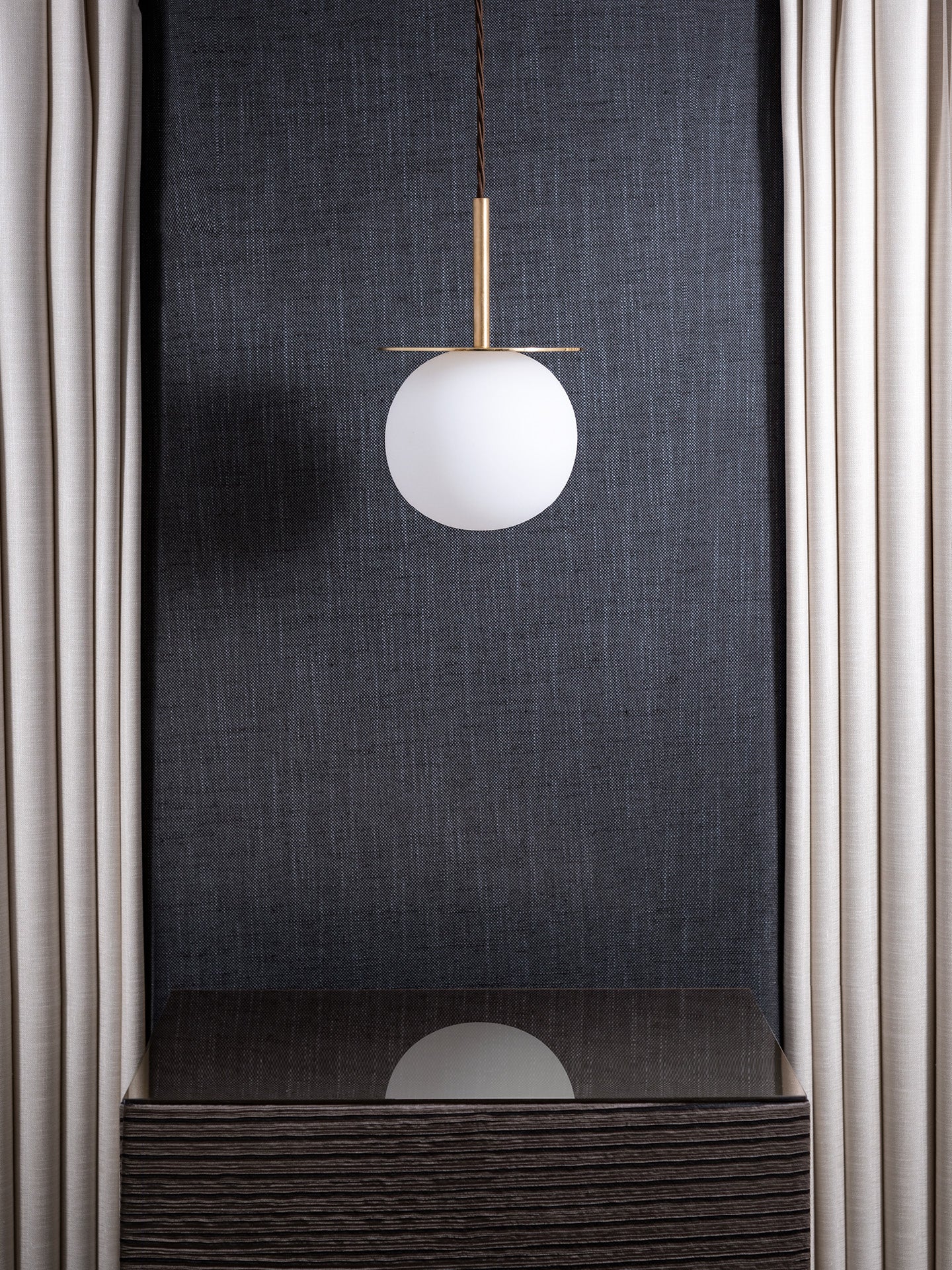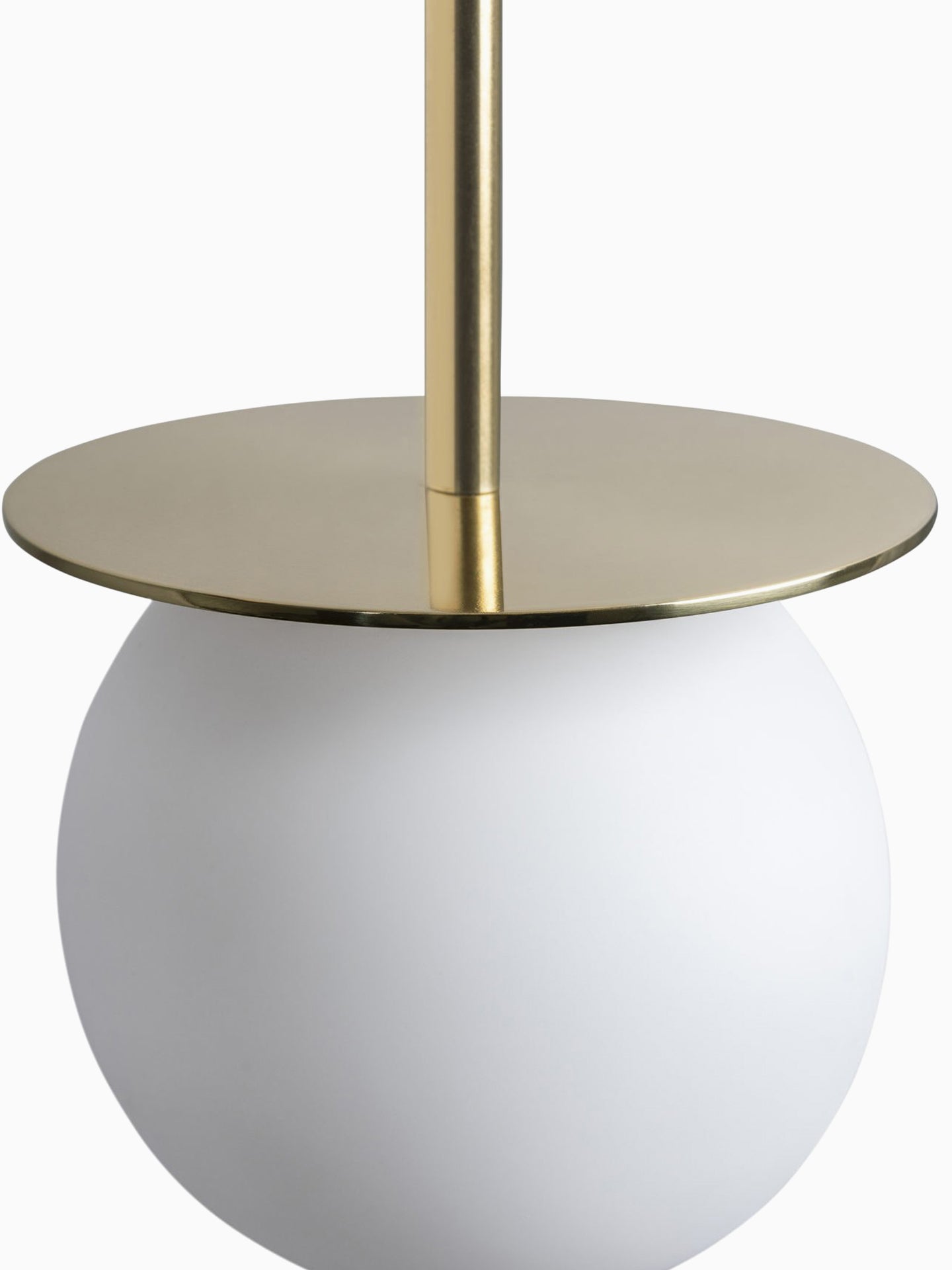 Both simple and elegant, our Halo pendant is timeless in nature. The signature polished brass disk sits above the glass shade and as a result, features its own uniquely mirrored reflections of the soft Opal glass sphere.