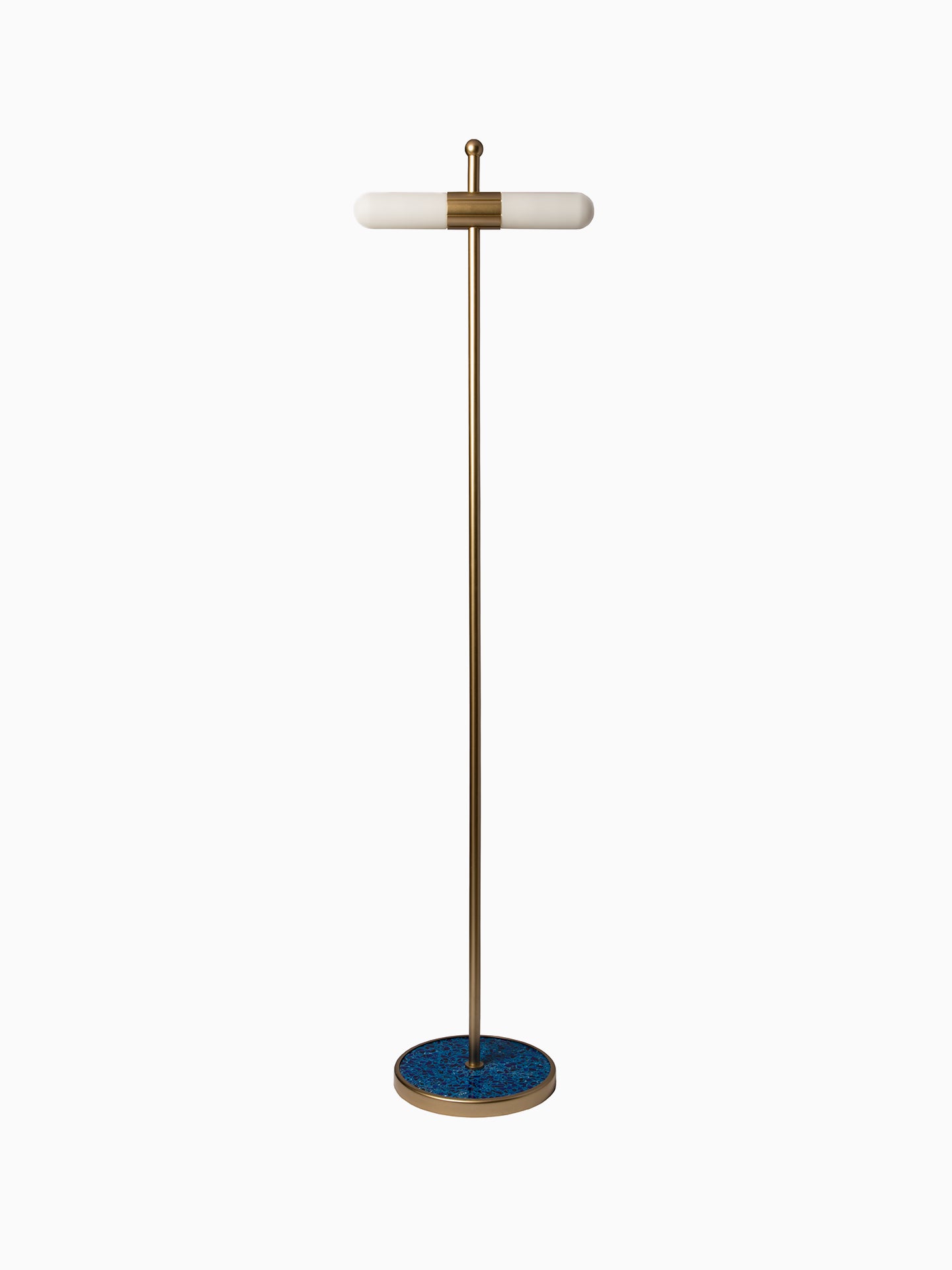 A minimal and sophisticated form, this floor lamp features a two-tone cylindrical base. The vertical stem leads to a ribbed centre body and two delicately lit opal glass capsules.
