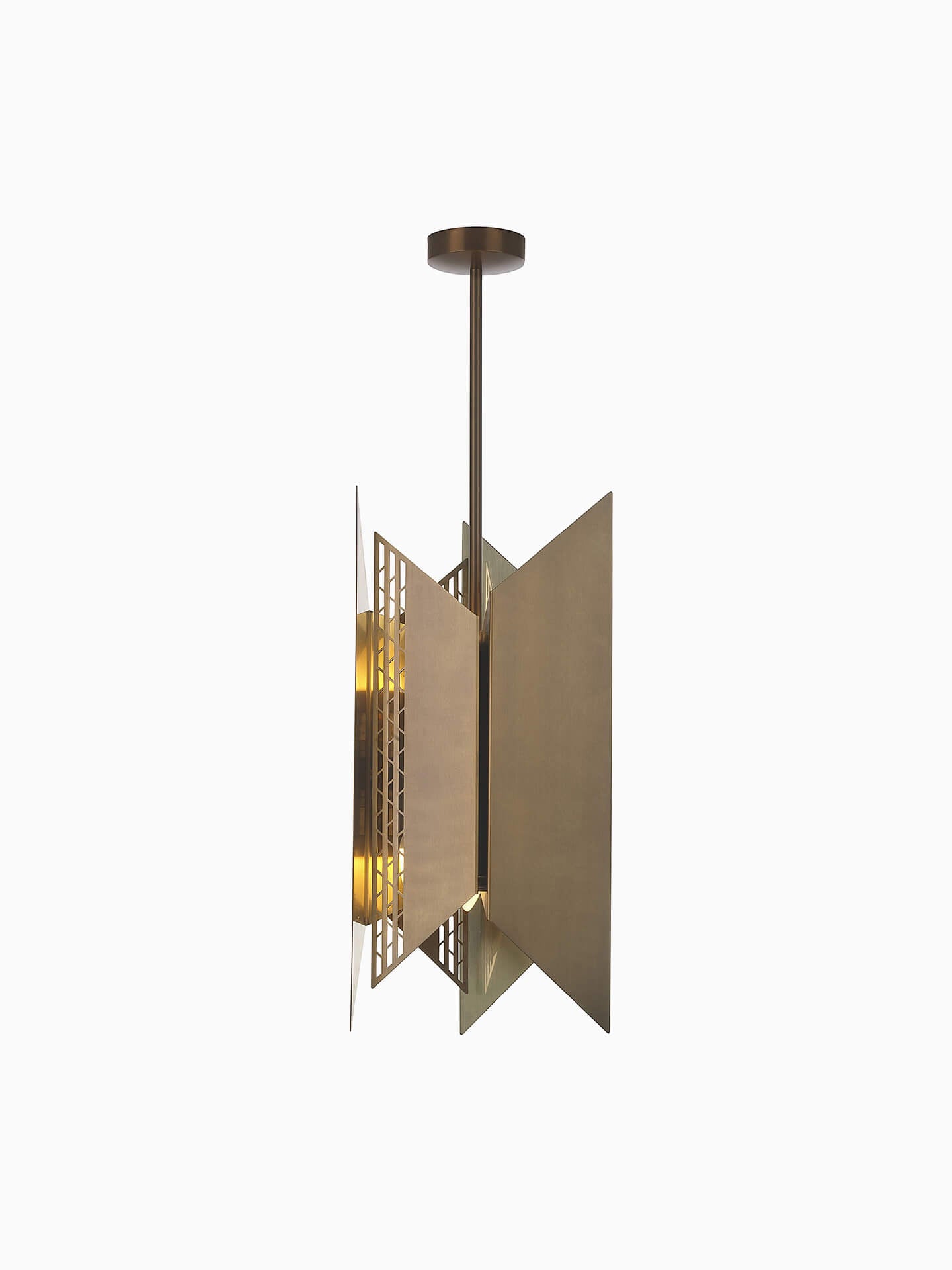 Taking influence from geometric mid-century sculptures, the Hera Pendant is a highly distinctive design, finished in antique brass and with intricately cut detailing.