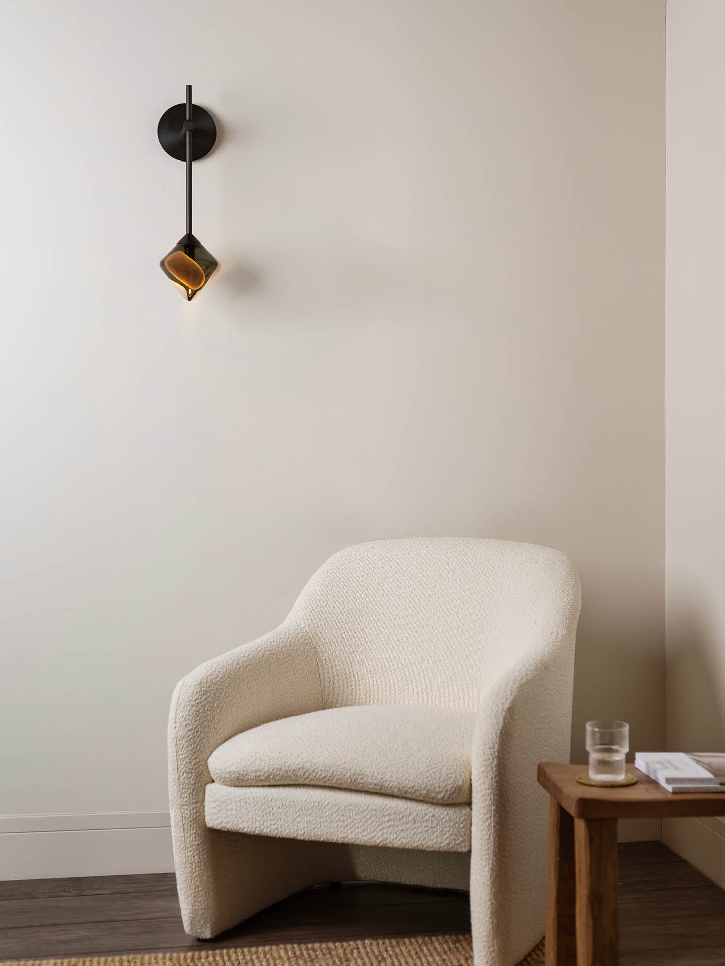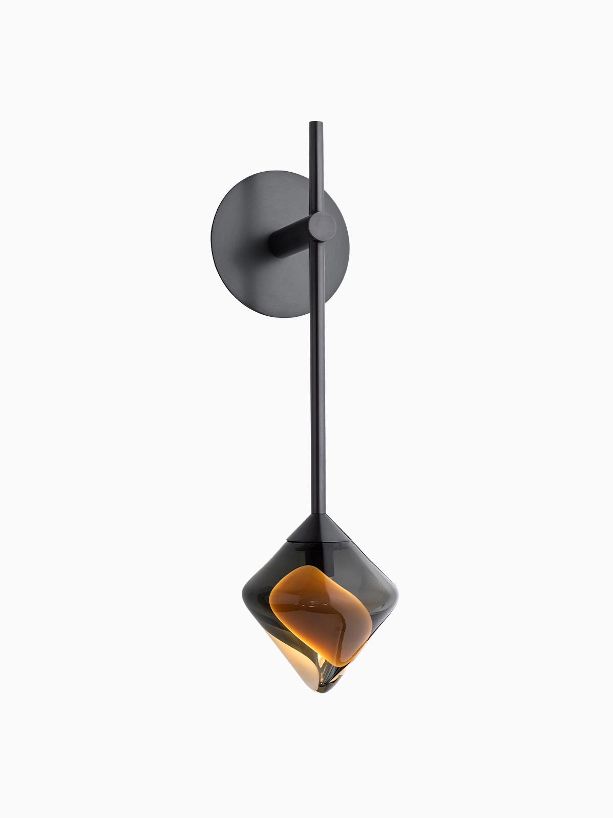 The Koa wall light features the range’s distinctive diamond-shaped glass in earthy tones of brown, beige and smoke. The Bronze metalwork has a simple rounded intersection, allowing the warm glow of the glass to be the focal point of the light.