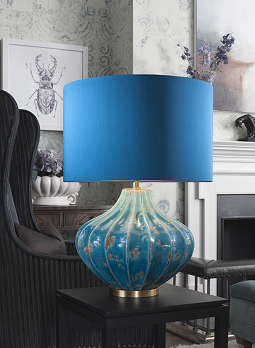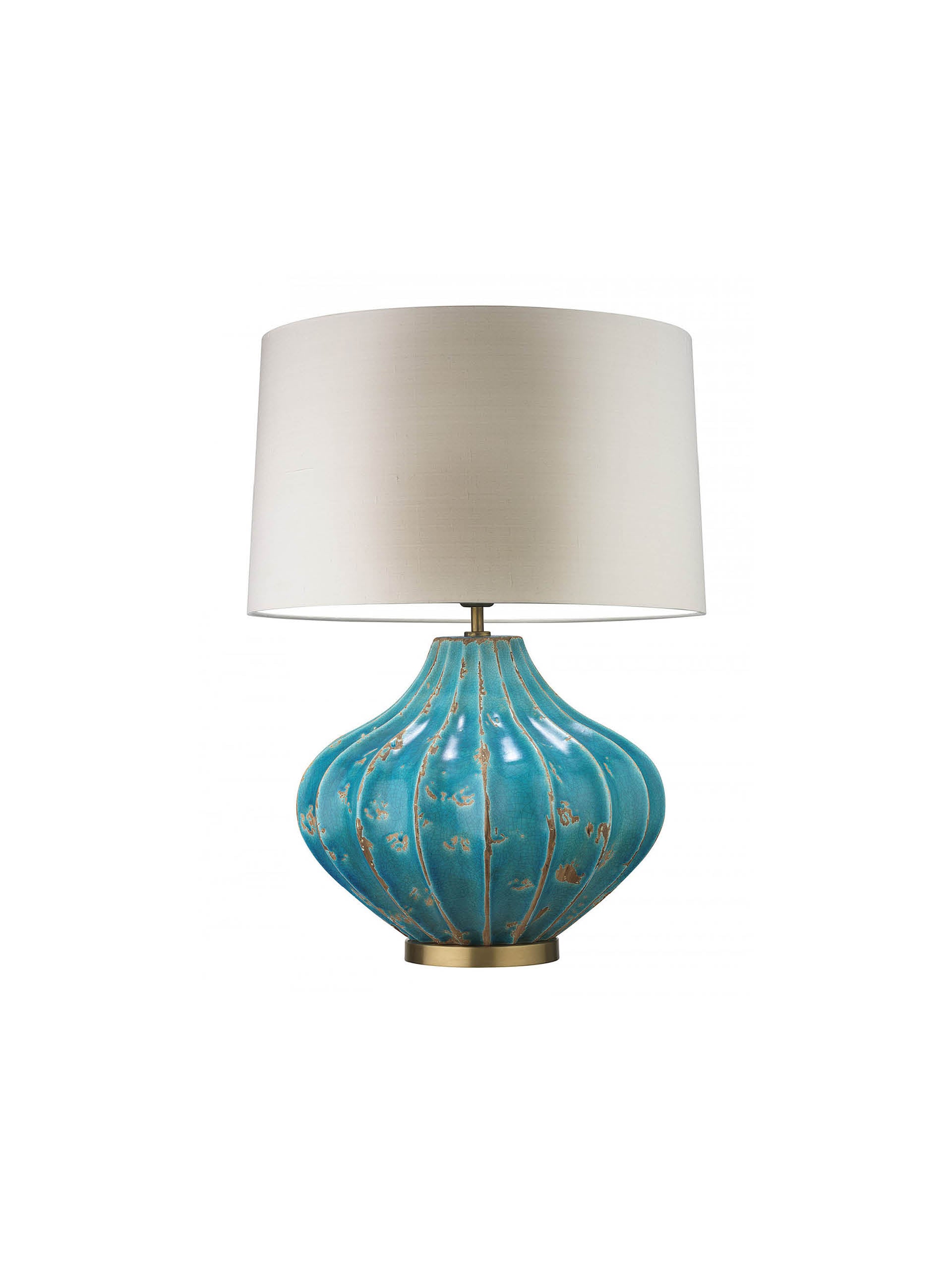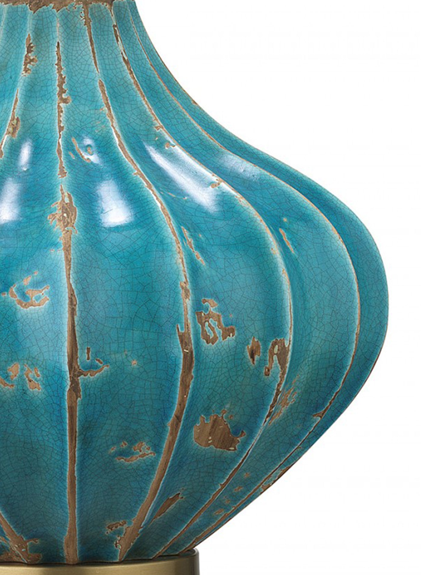 The Mallory table lamp features a beautifully crafted turquoise ceramic base with an antique, distressed finish. Its unique shape and vibrant color make it a perfect accent piece for any room.