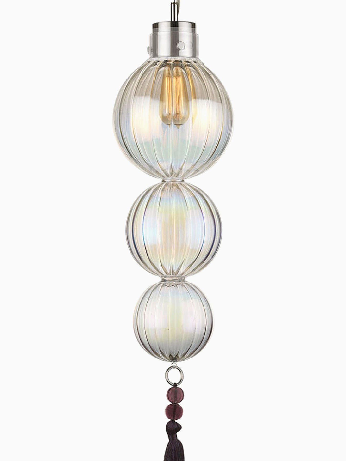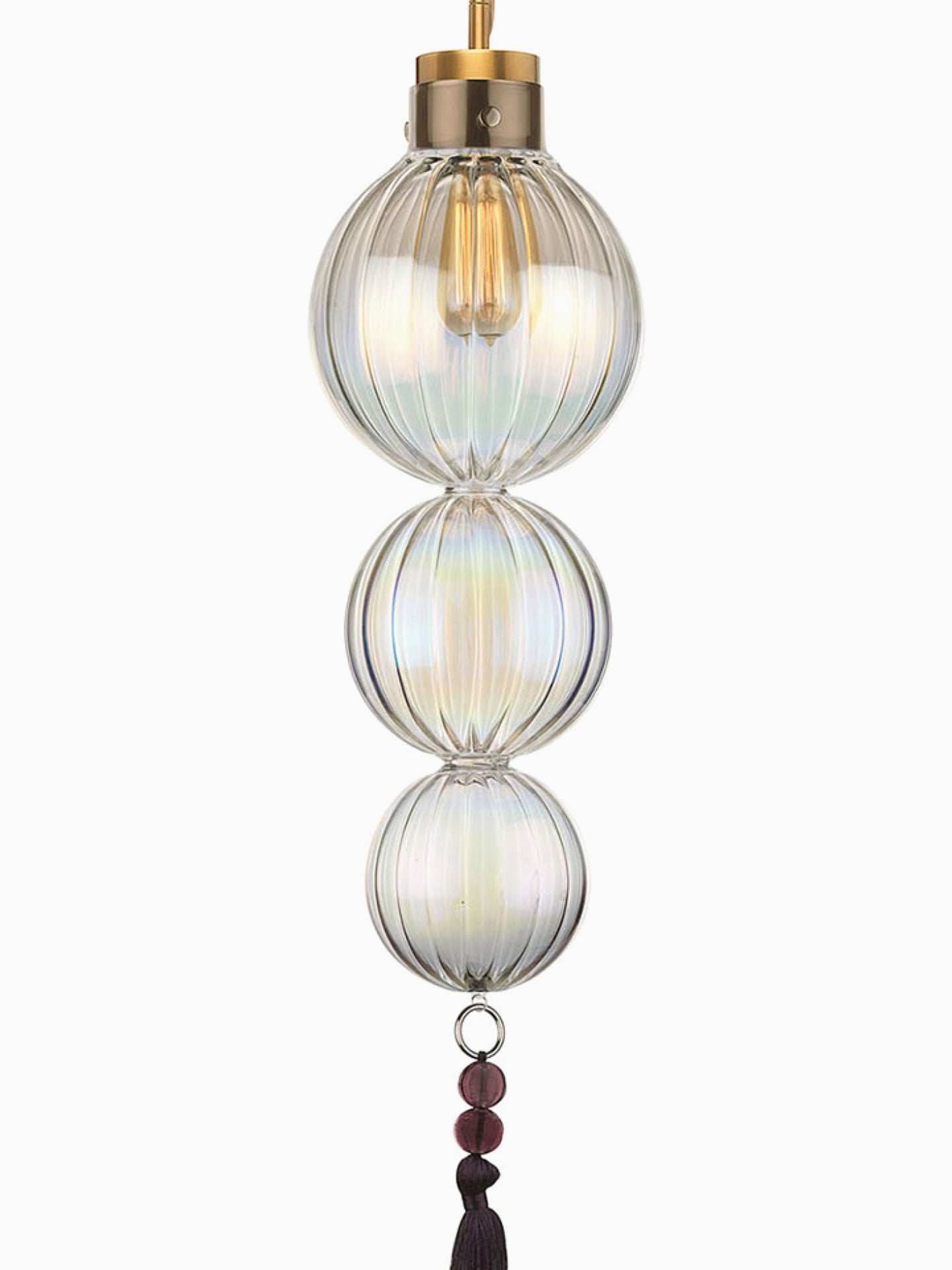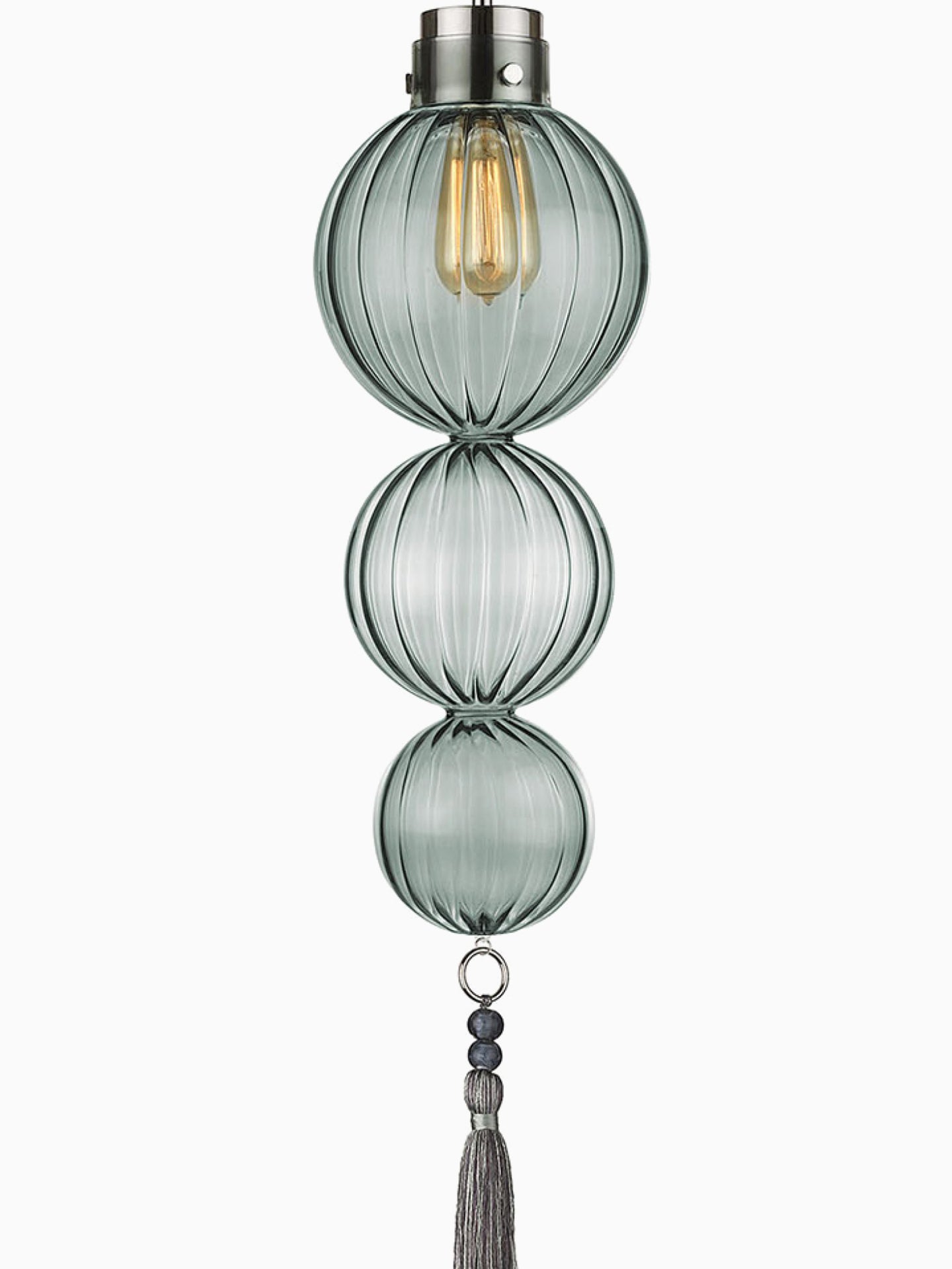 Taking inspiration directly from souks in the Medina, this sophisticated pendant features simple metalwork with fluted blown glass and a beaded decorative tassel.