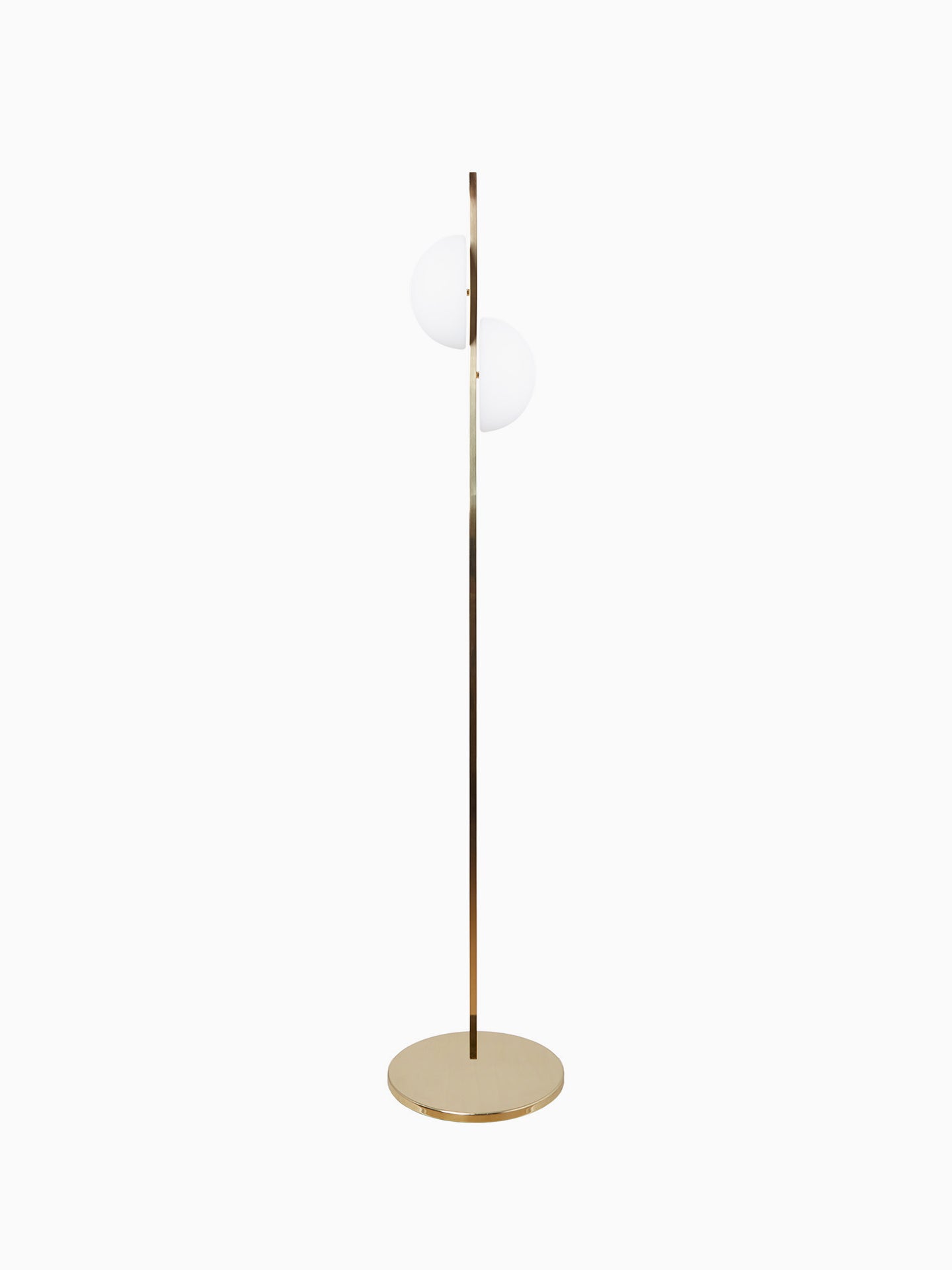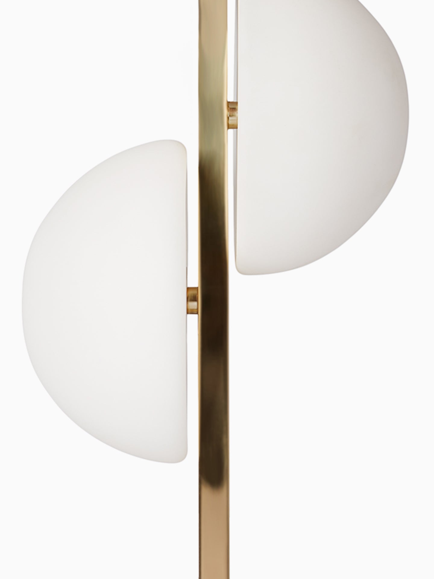 Our Nacchera floor lamp is a contemporary reinterpretation of the natural curvature found in mother of pearl. The lamp features two offset opal glass hemispheres that provide a soft, delicate glow.