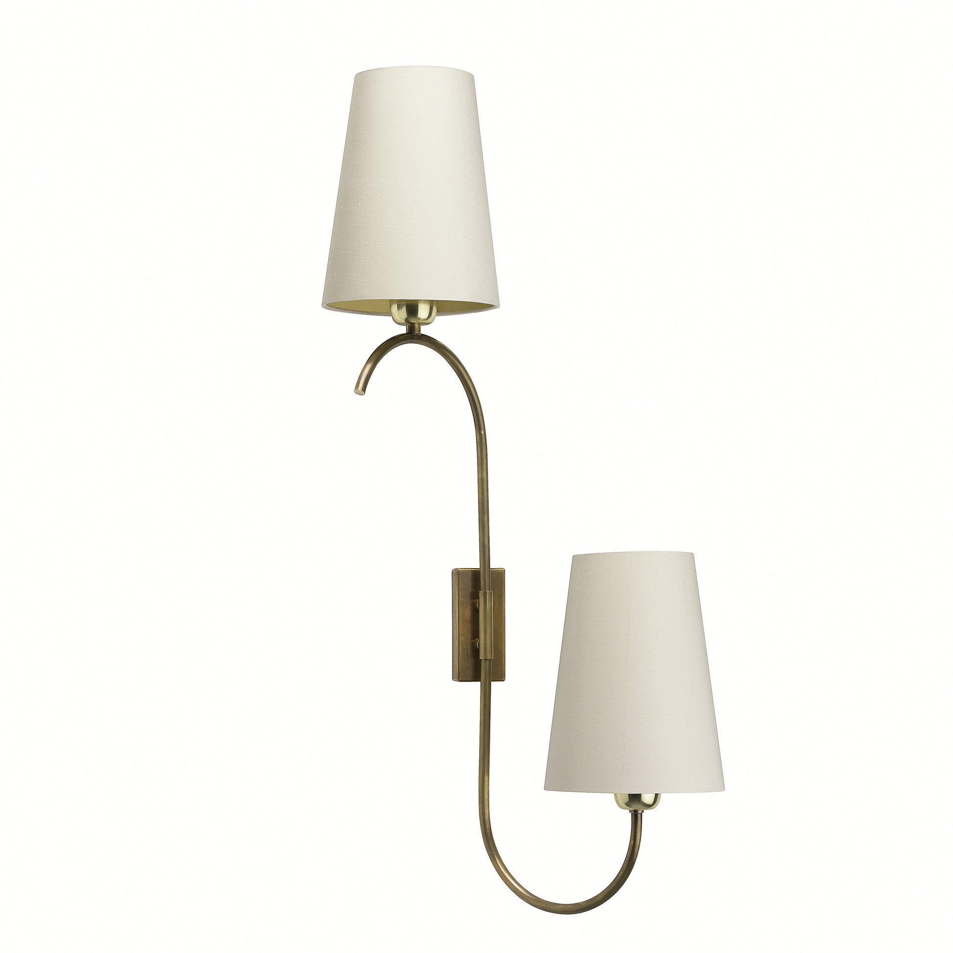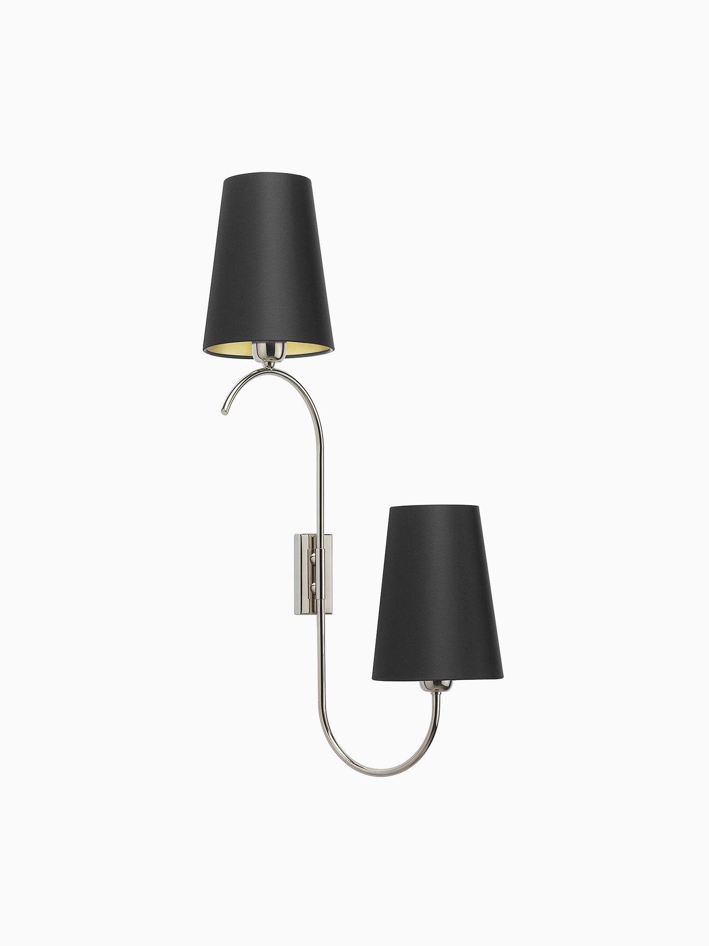 The Oria wall lamp features an elegant polished nickel or antique brass finish with a unique dual-arm design.
