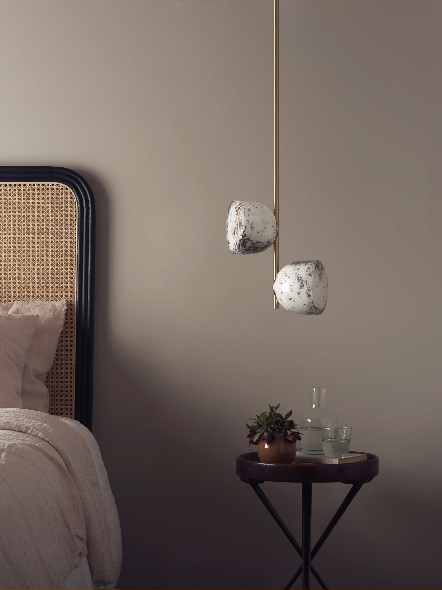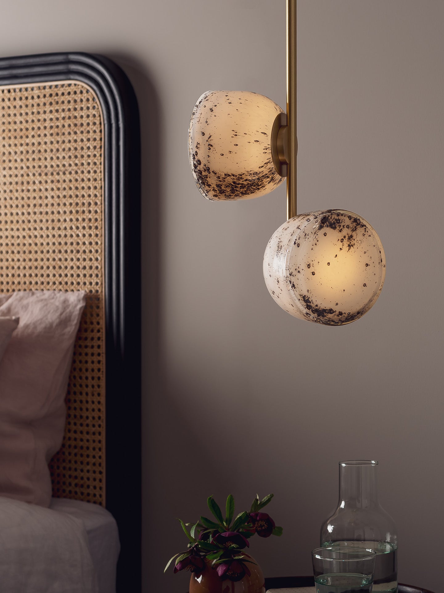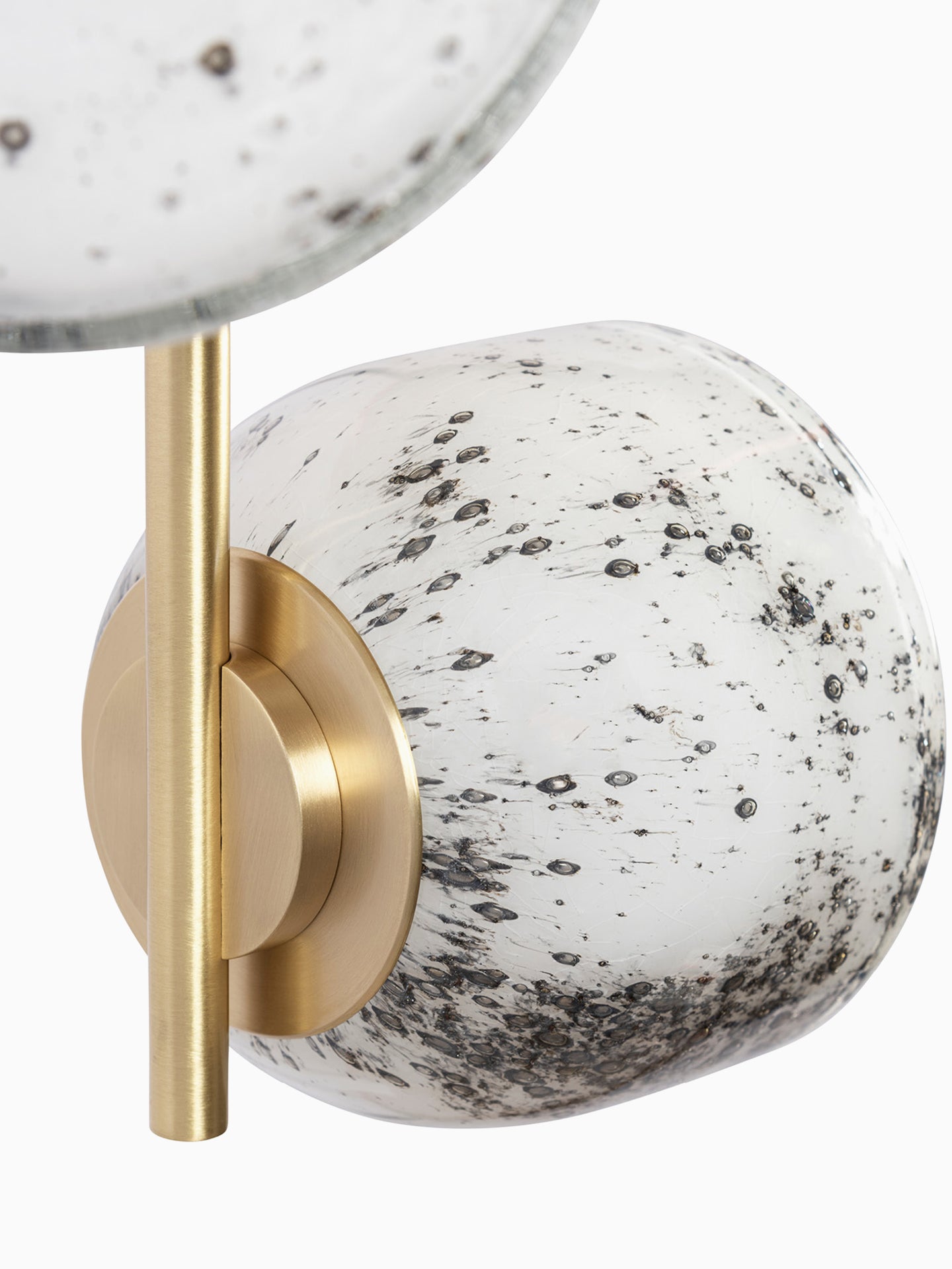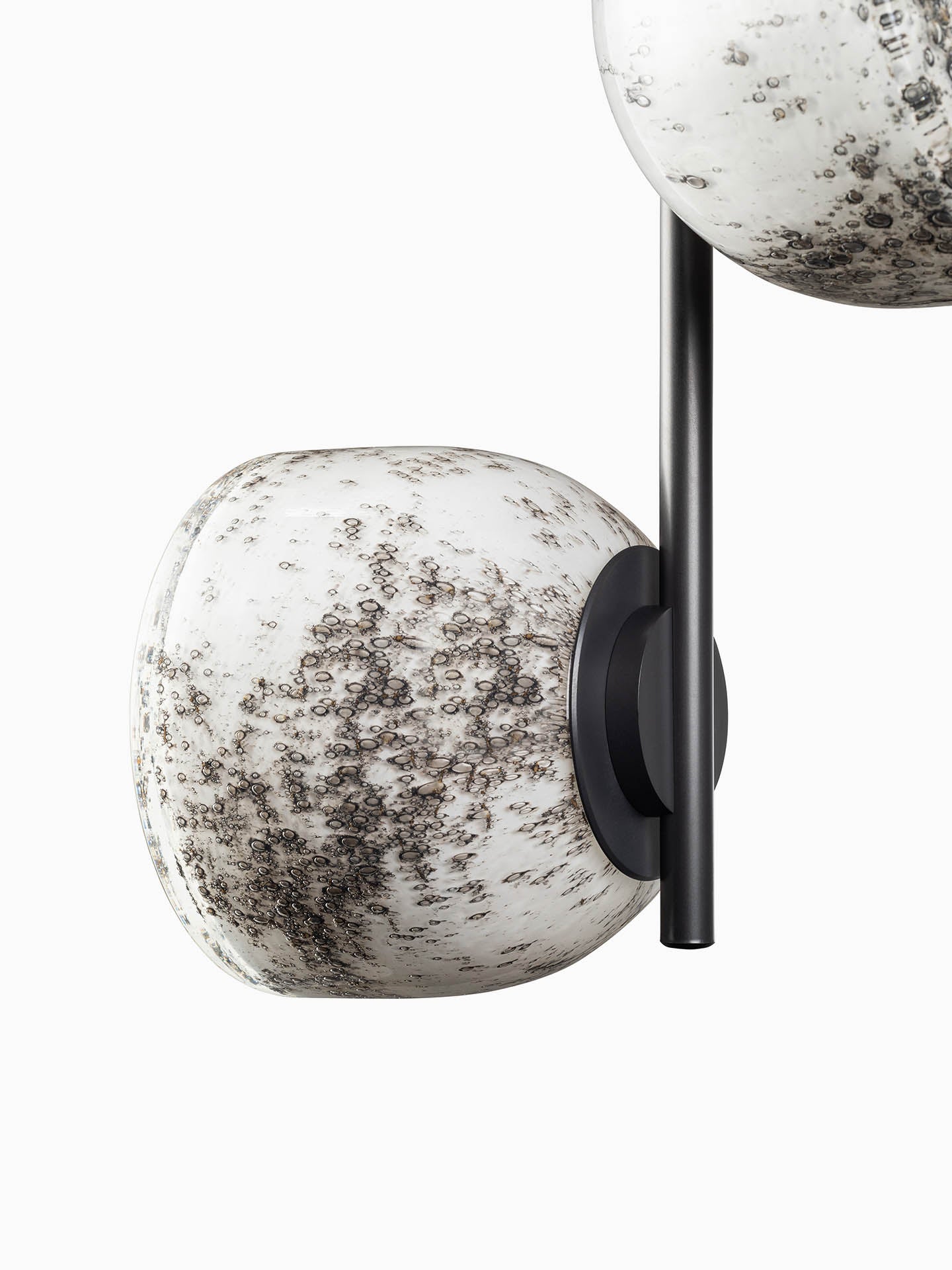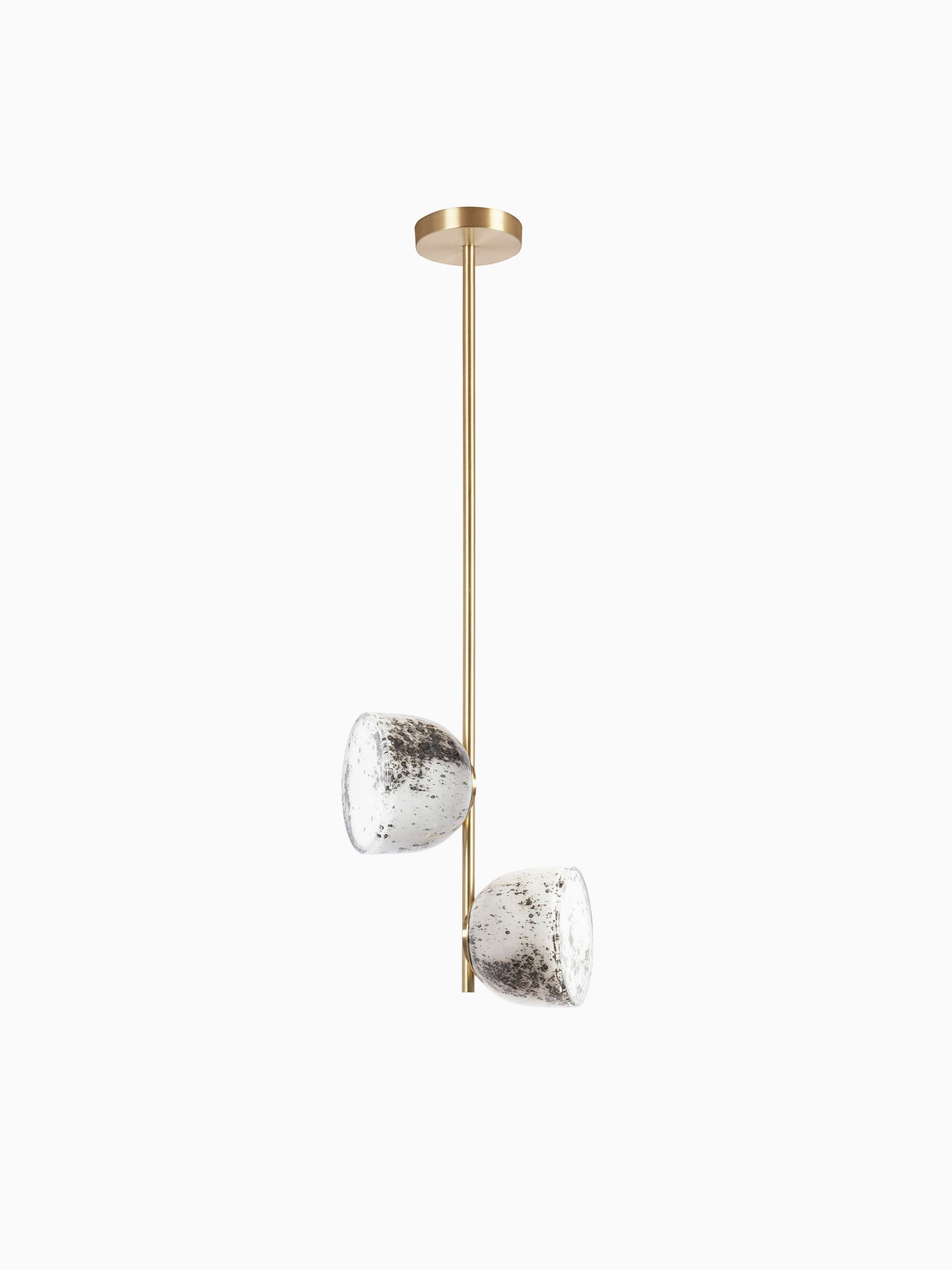Positioned carefully around the minimal form of our Orla vertical pendant, multiple bowl shaped glasses frame the unique volcanic frit finish. Individually forged in the heat of the molten glass, metallic grains react across the surface, providing infinite variations of markings on each piece.