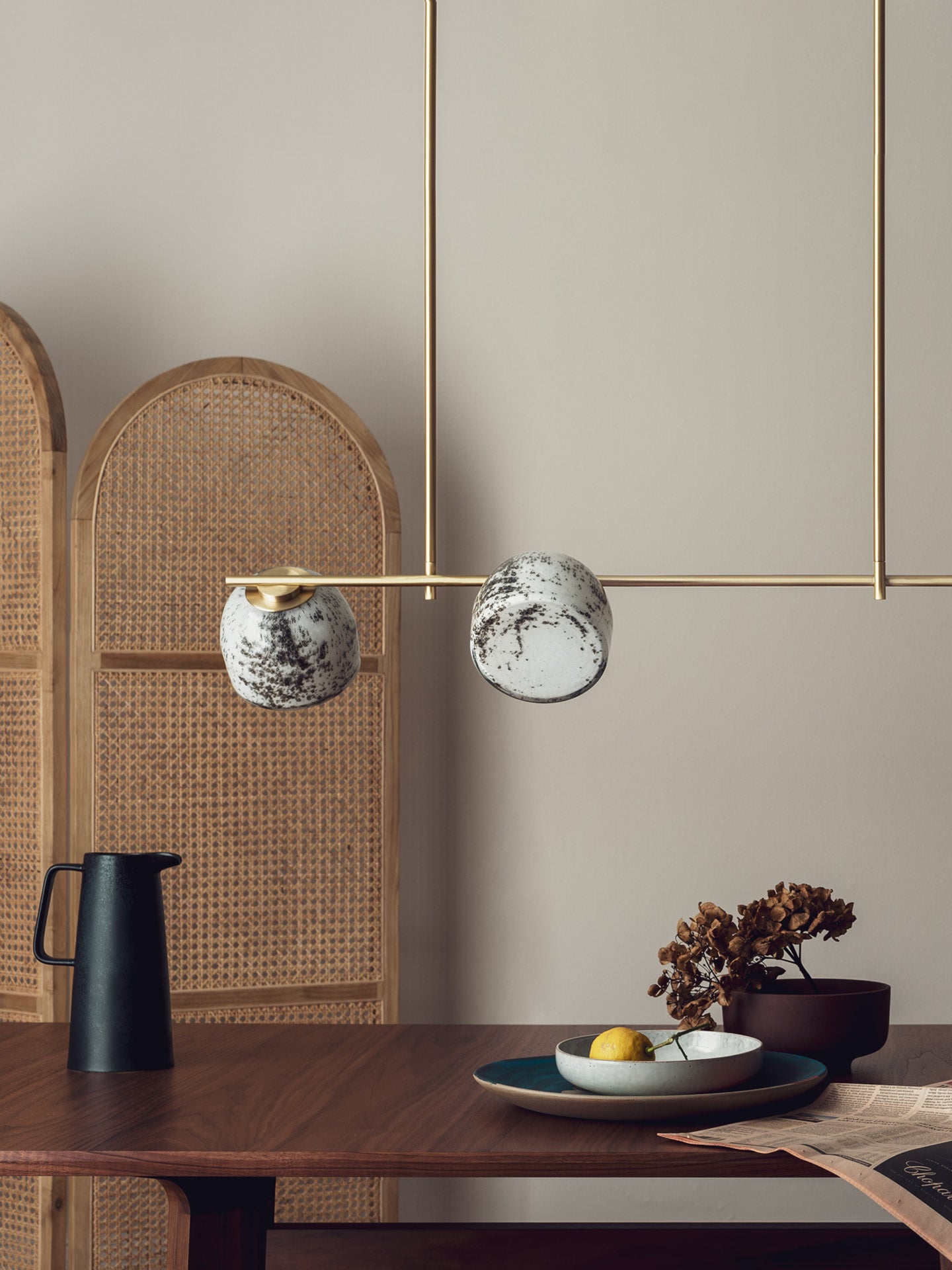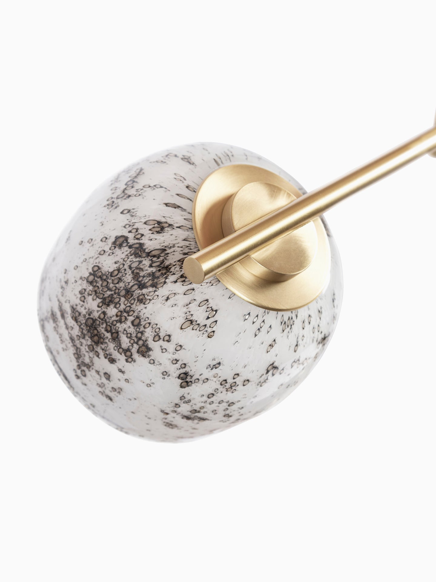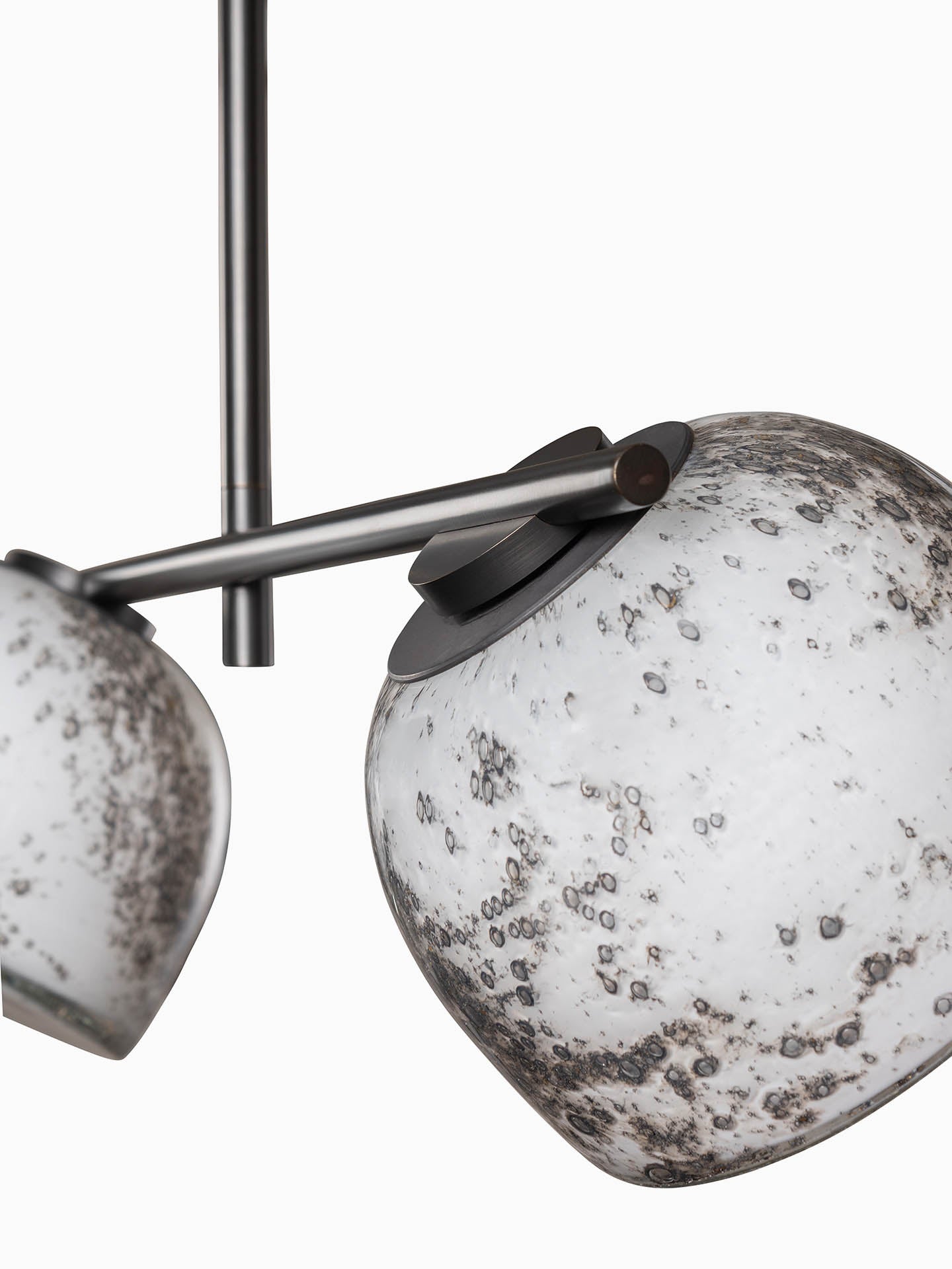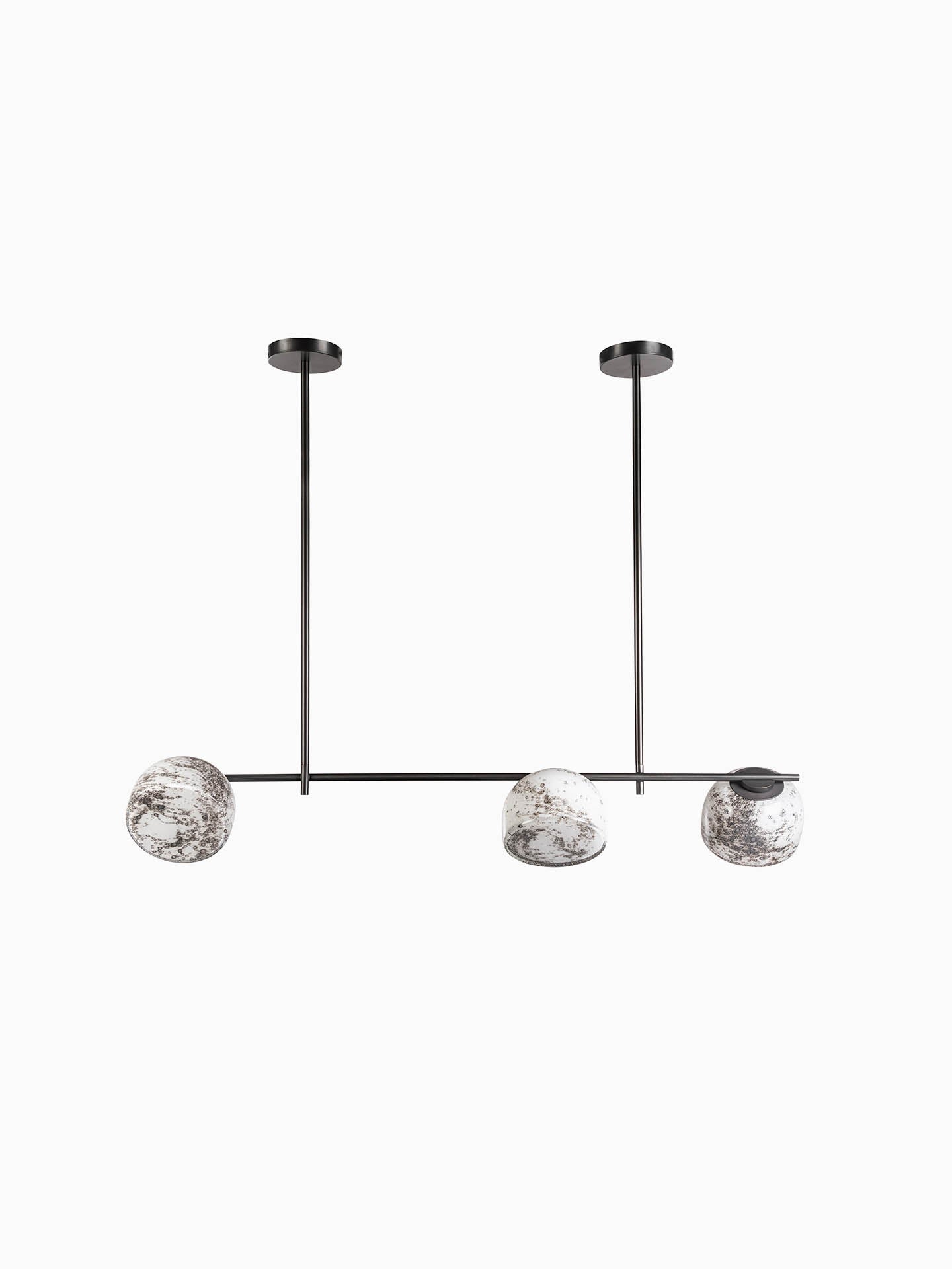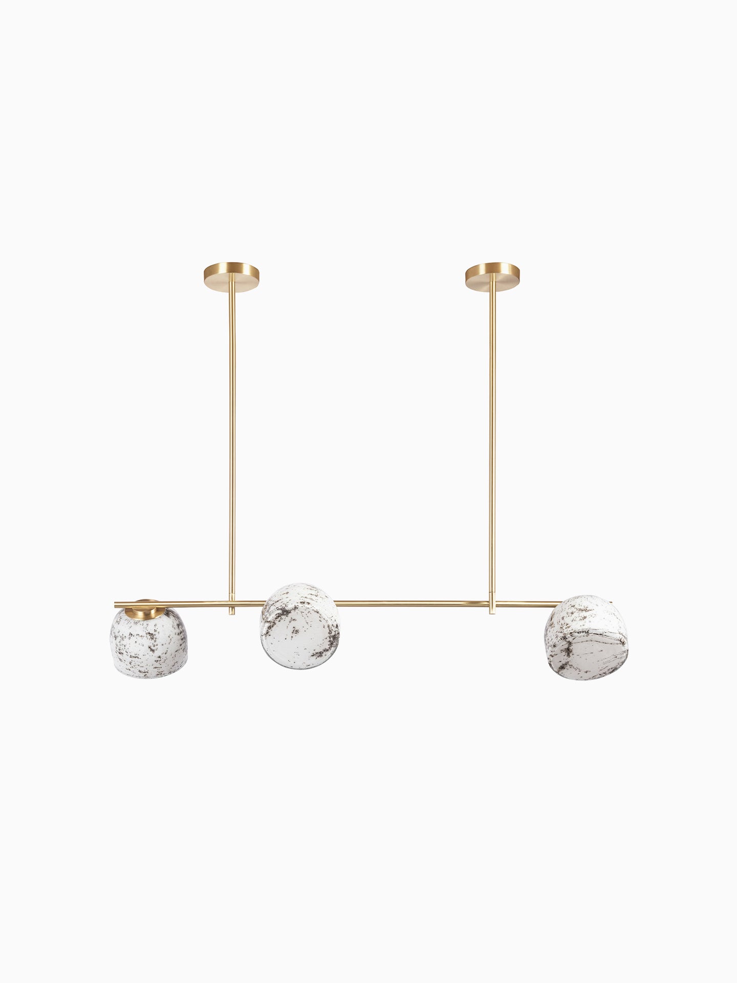 Delicately tapered glass shades are asymmetrically positioned around the linear frame of our Orla horizontal pendant. Each speckled glass surface highlights the unique markings of each piece, providing a delicate glow to its surroundings.