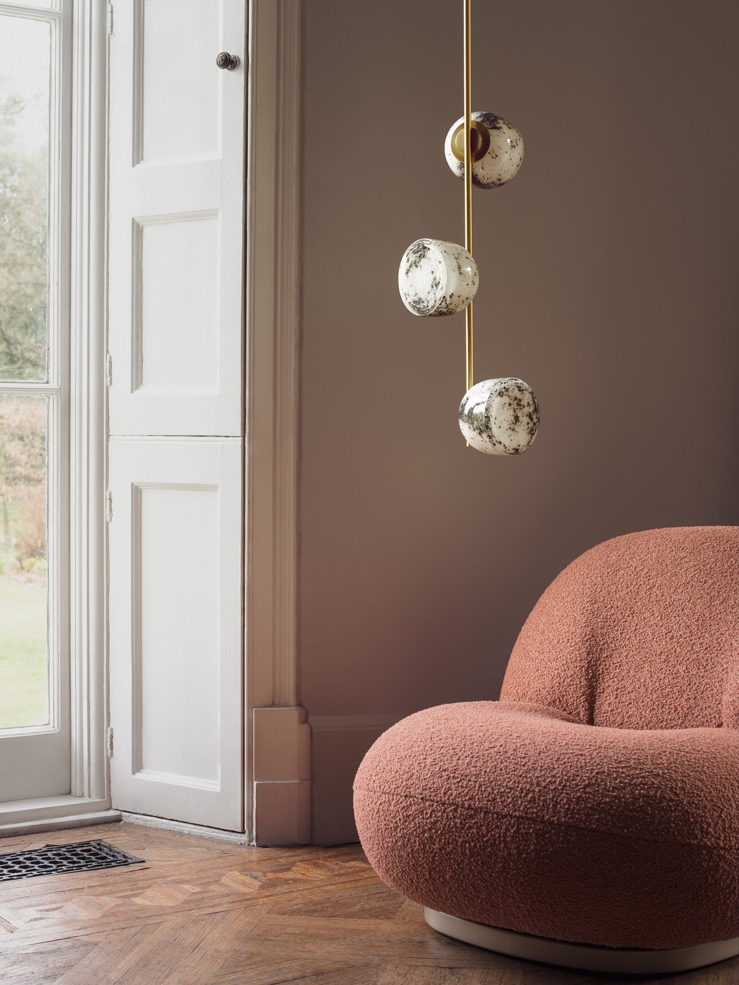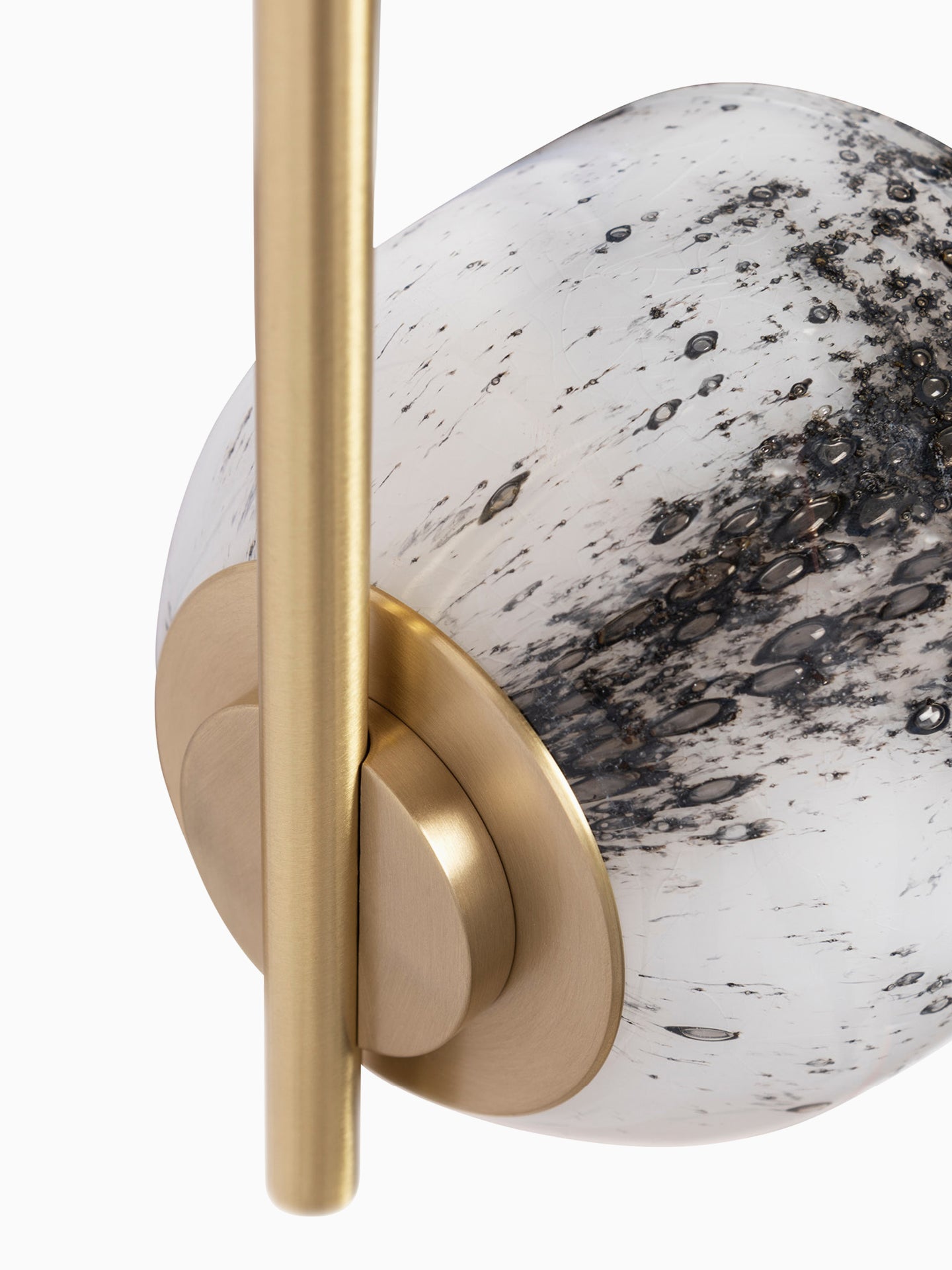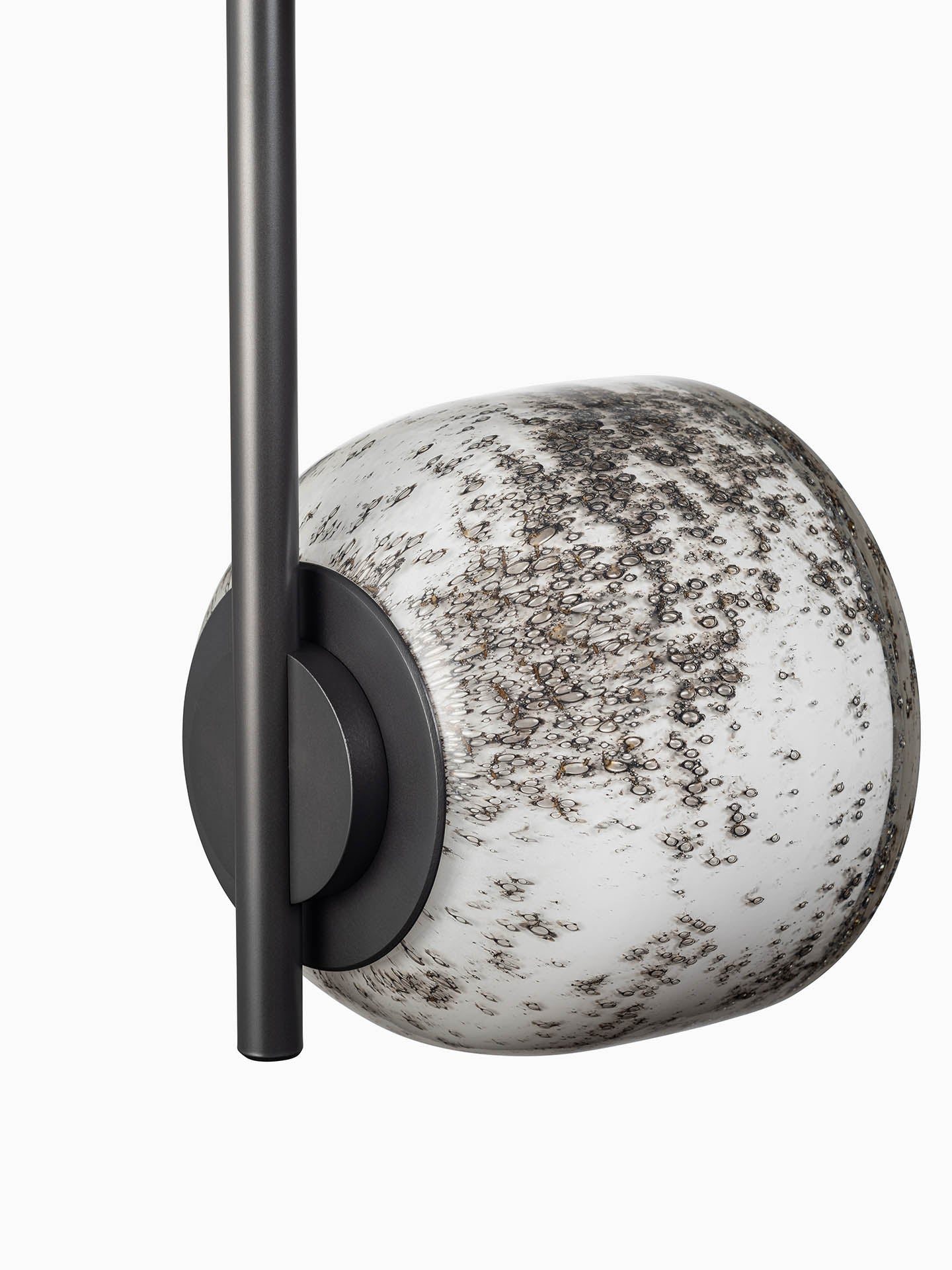 Positioned carefully around the minimal form of our Orla vertical pendant, multiple bowl shaped glasses frame the unique volcanic frit finish. Individually forged in the heat of the molten glass, metallic grains react across the surface, providing infinite variations of markings on each piece.