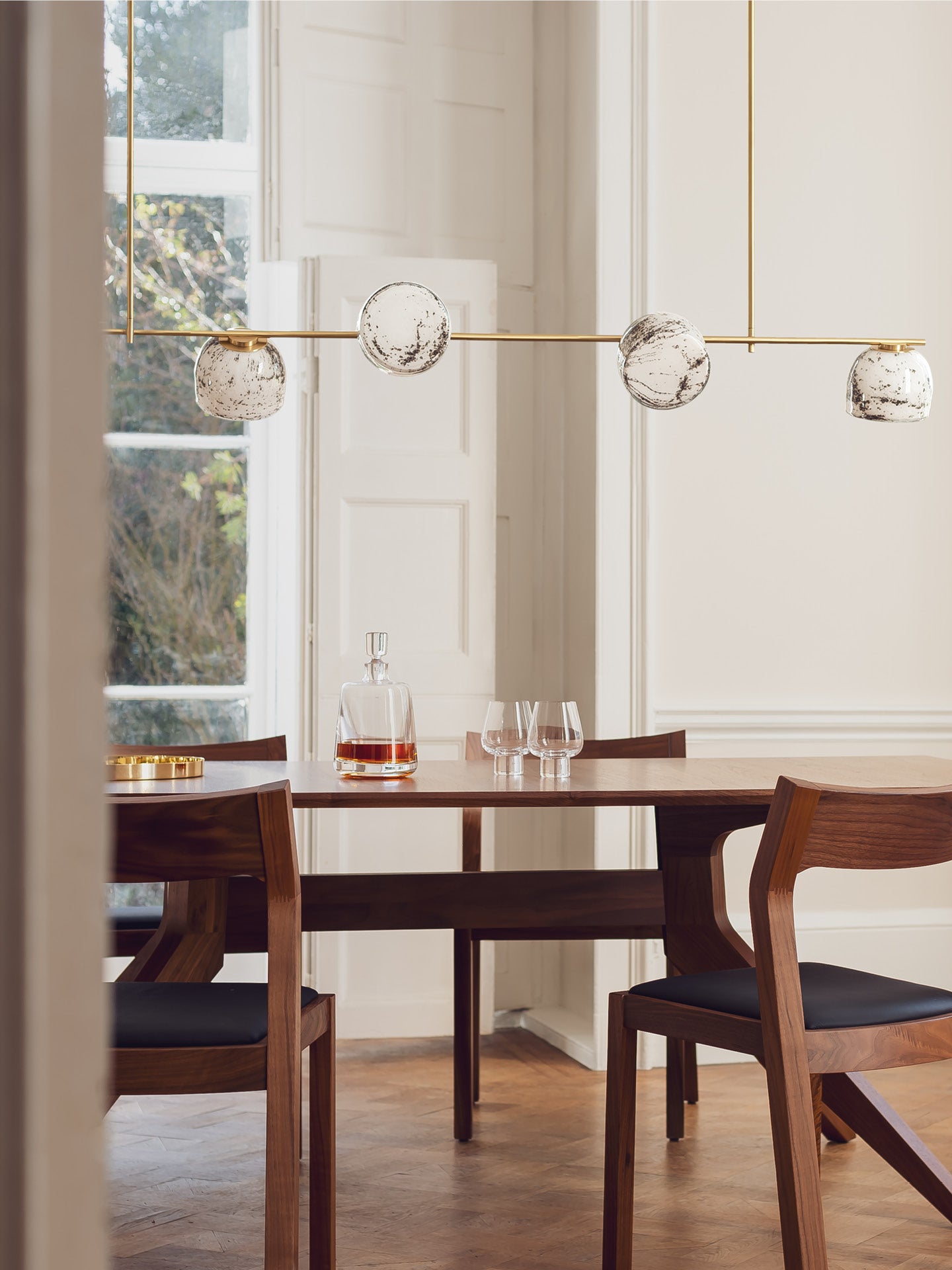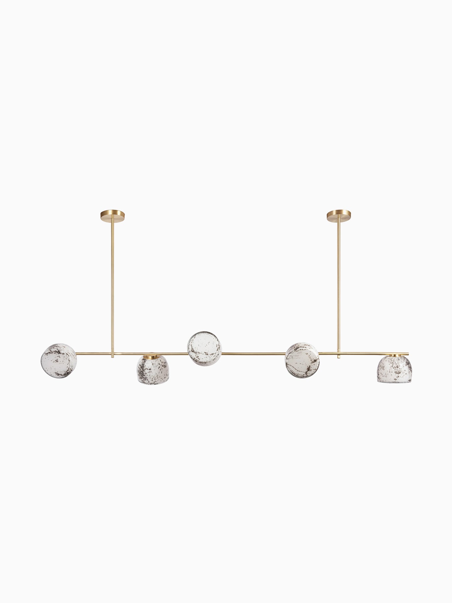 Delicately tapered glass shades are asymmetrically positioned around the linear frame of our Orla horizontal pendant. Each speckled glass surface highlights the unique markings of each piece.
