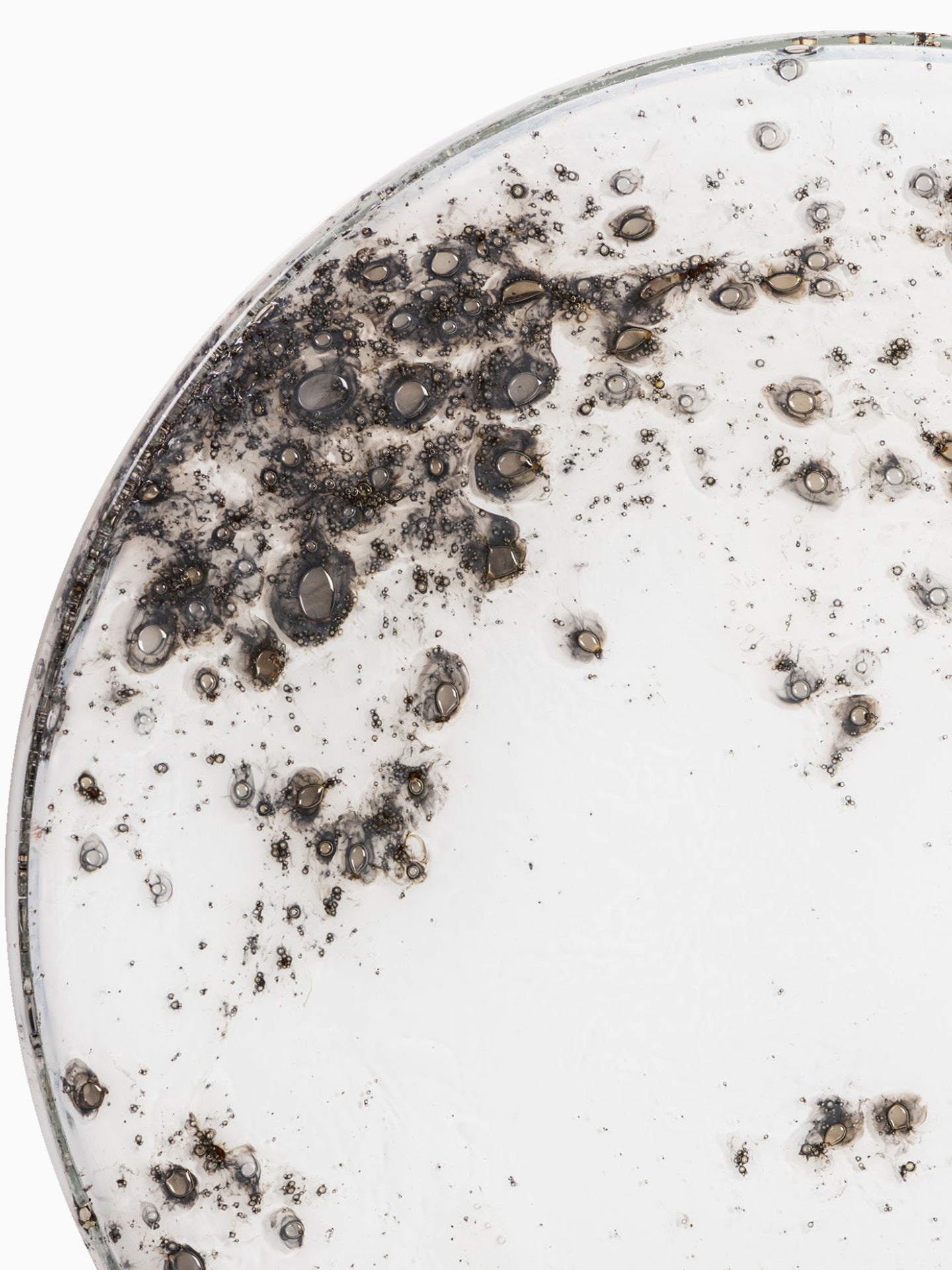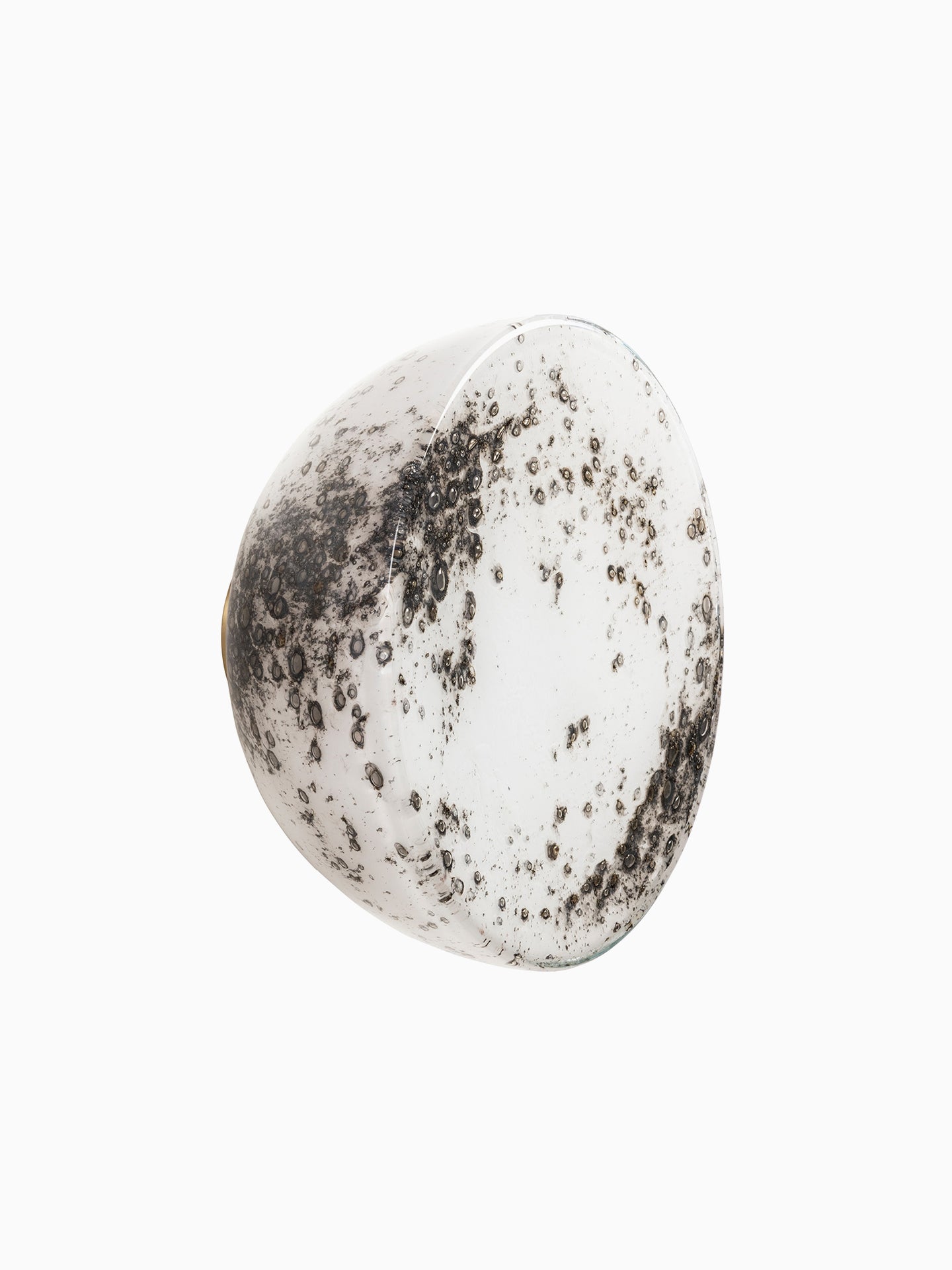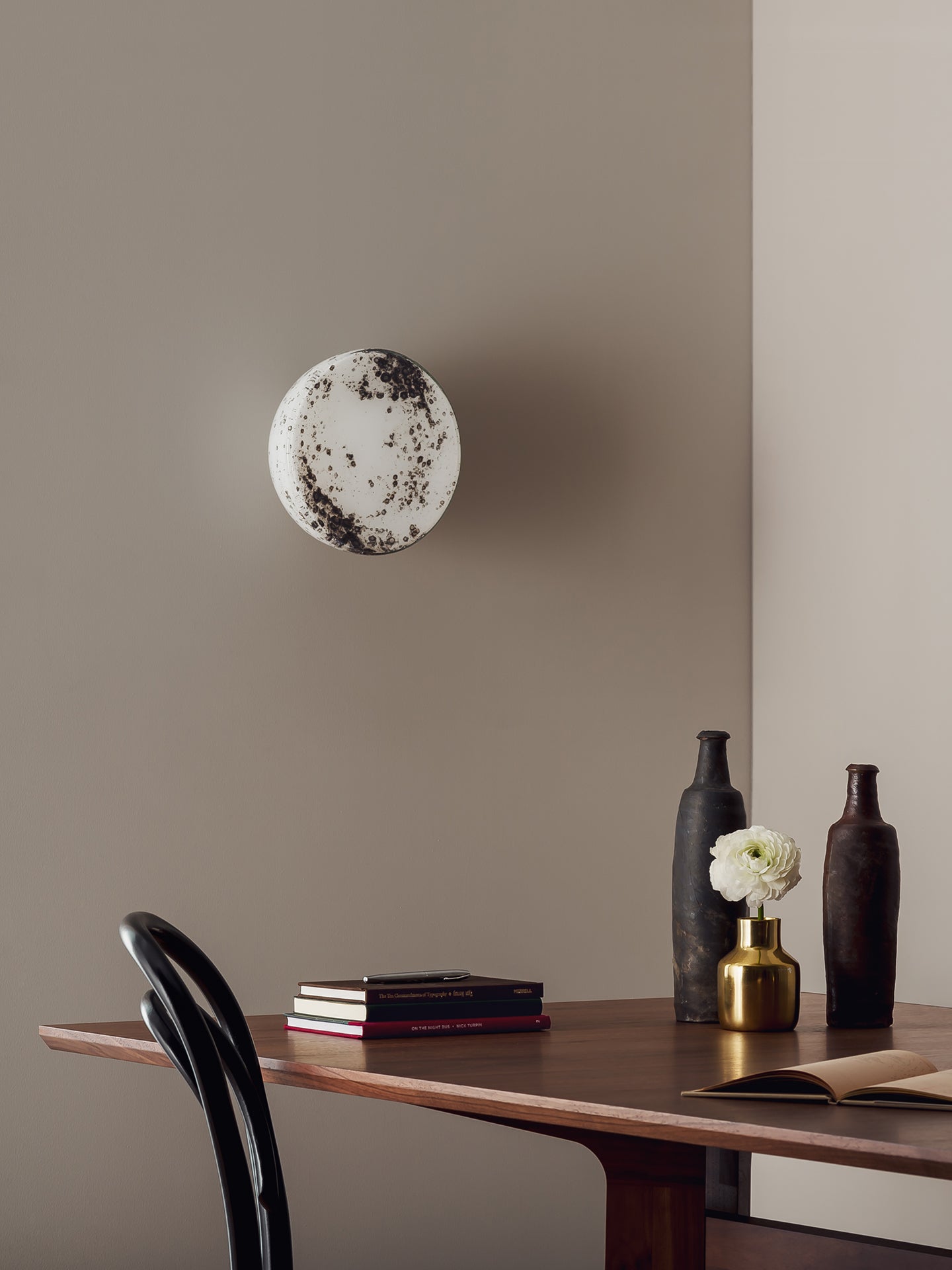 Protected in a cocoon formed by two layers of molten glass, metallic grains react across the surface of our Orla wall light. The delicately tapered bowl-shaped glasses frame the volcanic frit, creating infinite variations of markings on each piece.