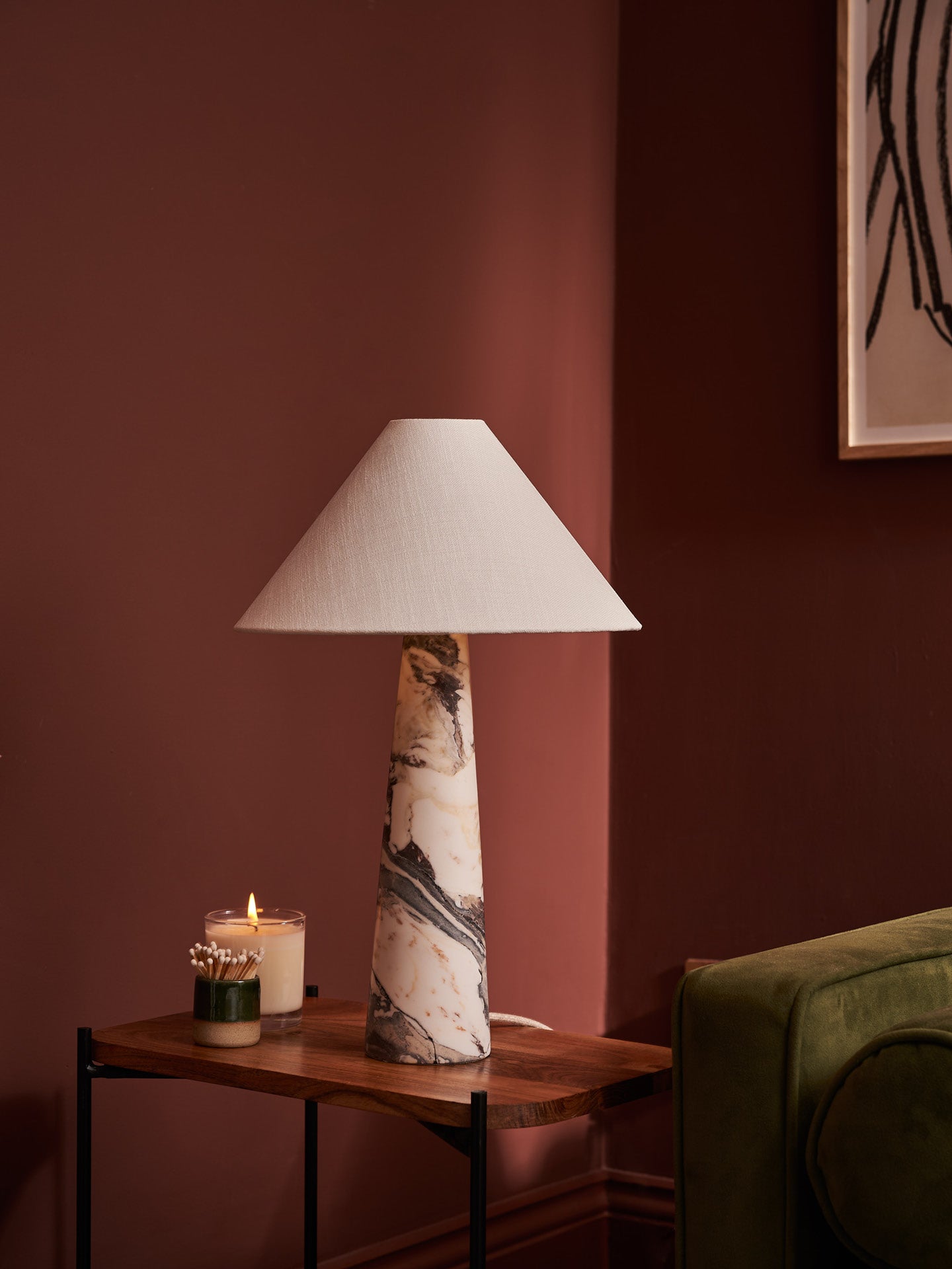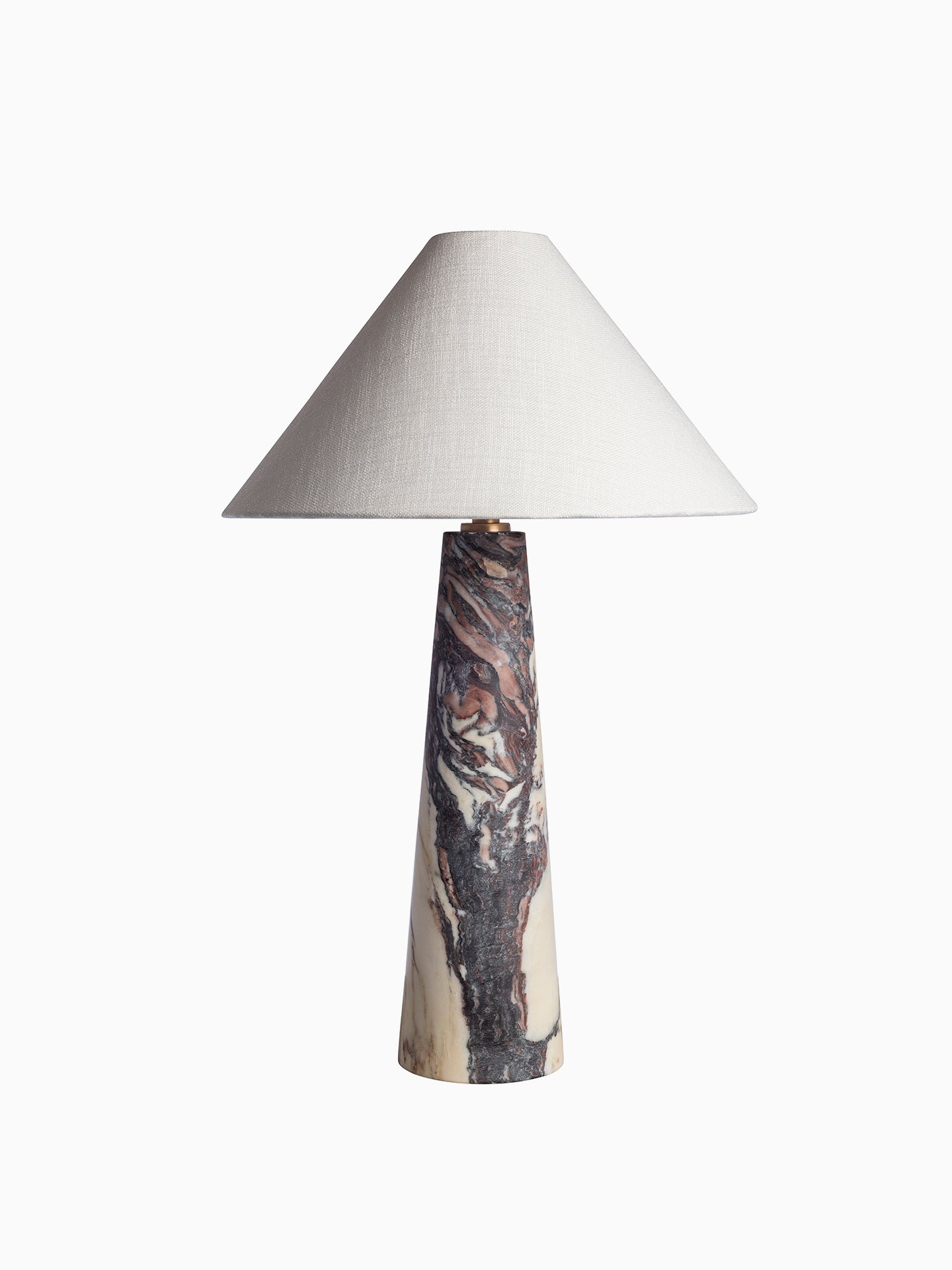 A wide, shallow shade sits elegantly atop a conical base of Breccia Capraia marble, in tones of deep violet and dusky pinks. A beautifully simple object by day that transforms itself, and your room, when lit by night.