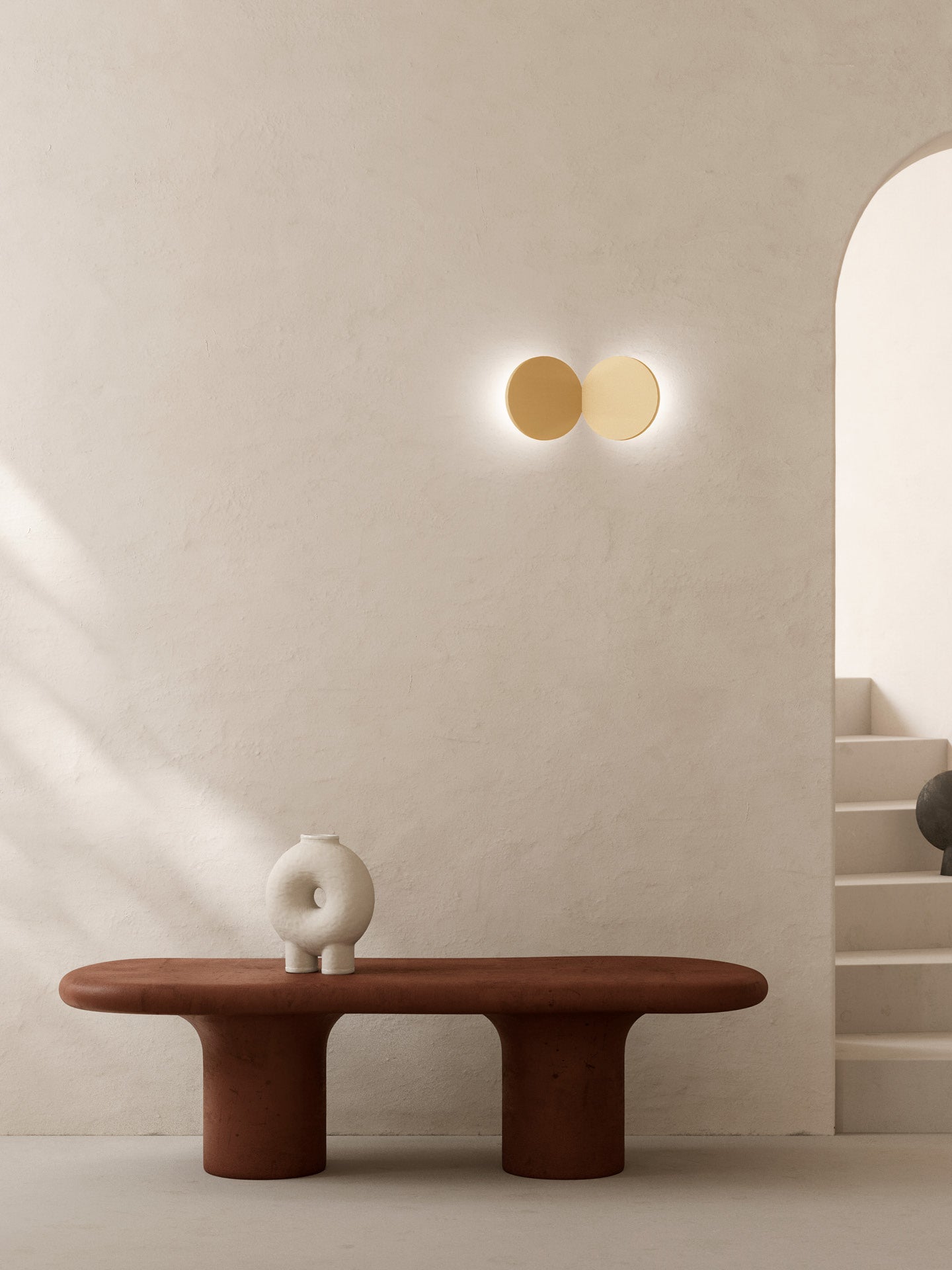 The Samara wall light combines contemporary design with precision manufacturing. The result, a silhouette that appears to delicately float alongside the surface of the wall. Light is emitted from two diffused LED discs facing the wall, reflecting a soft, warm glow back into the space. The backplate uses minimal hidden fixings enabling the design to be mounted horizontally or vertically, making it a popular choice for a bedside or hallway setting.