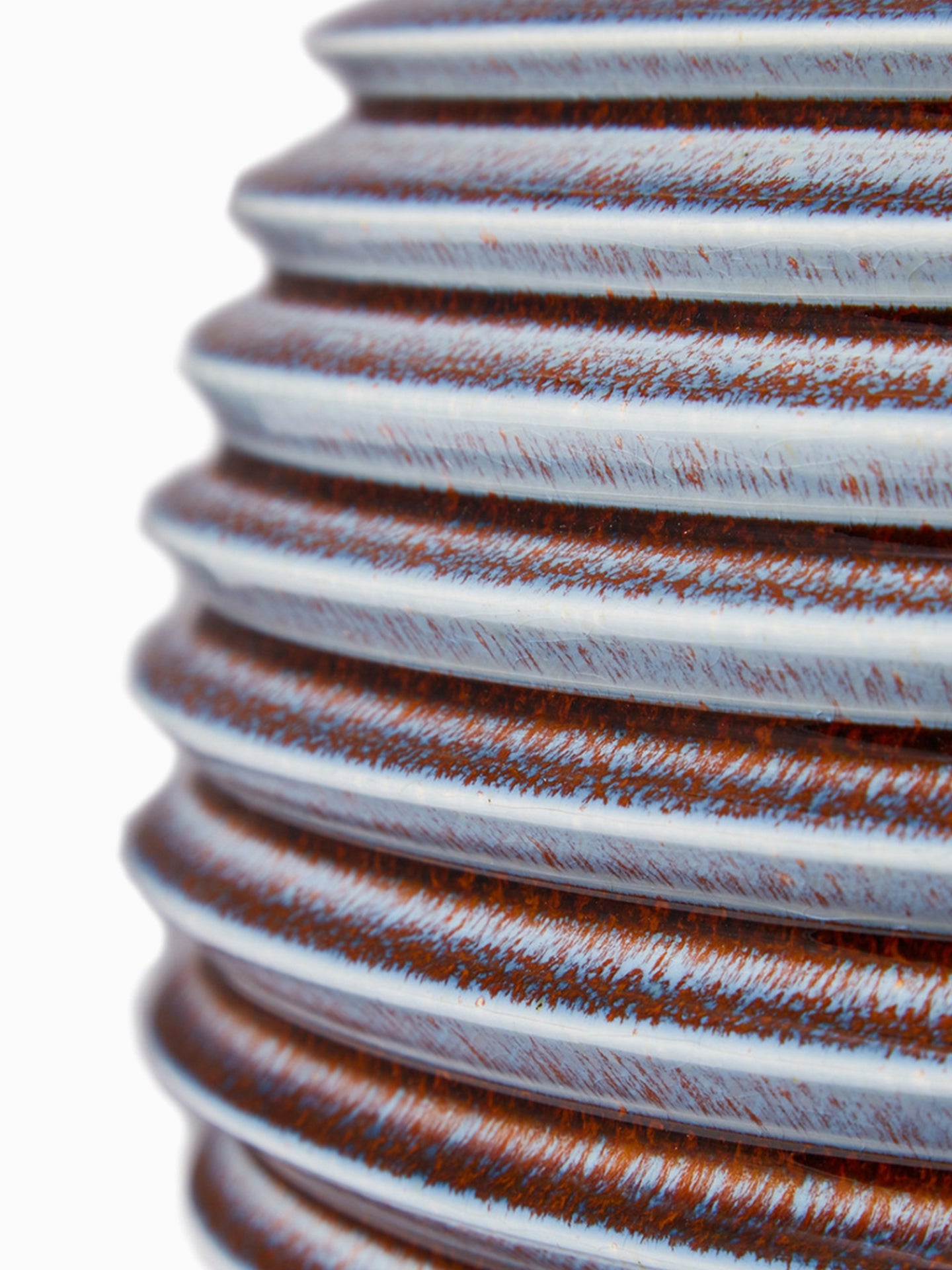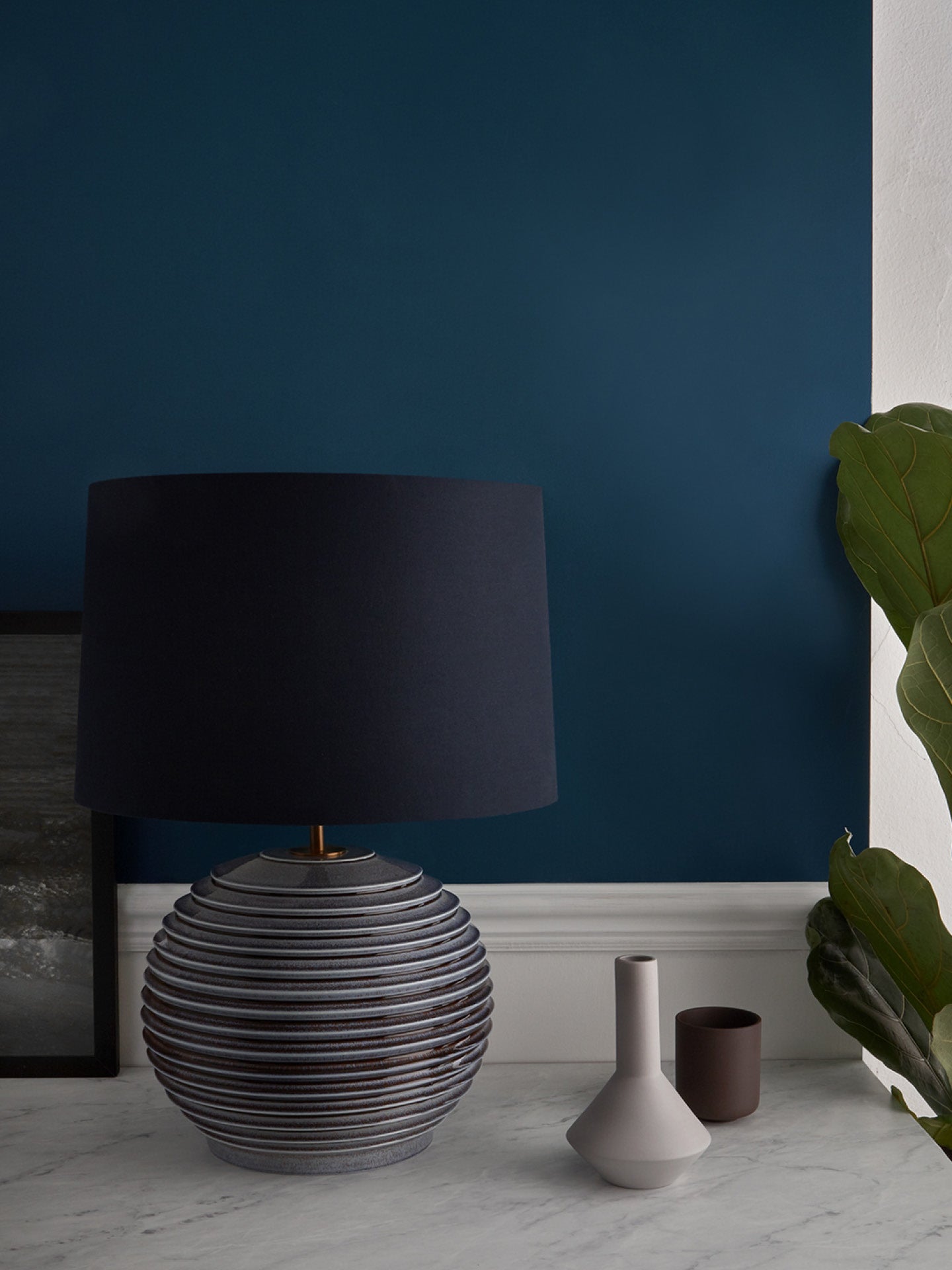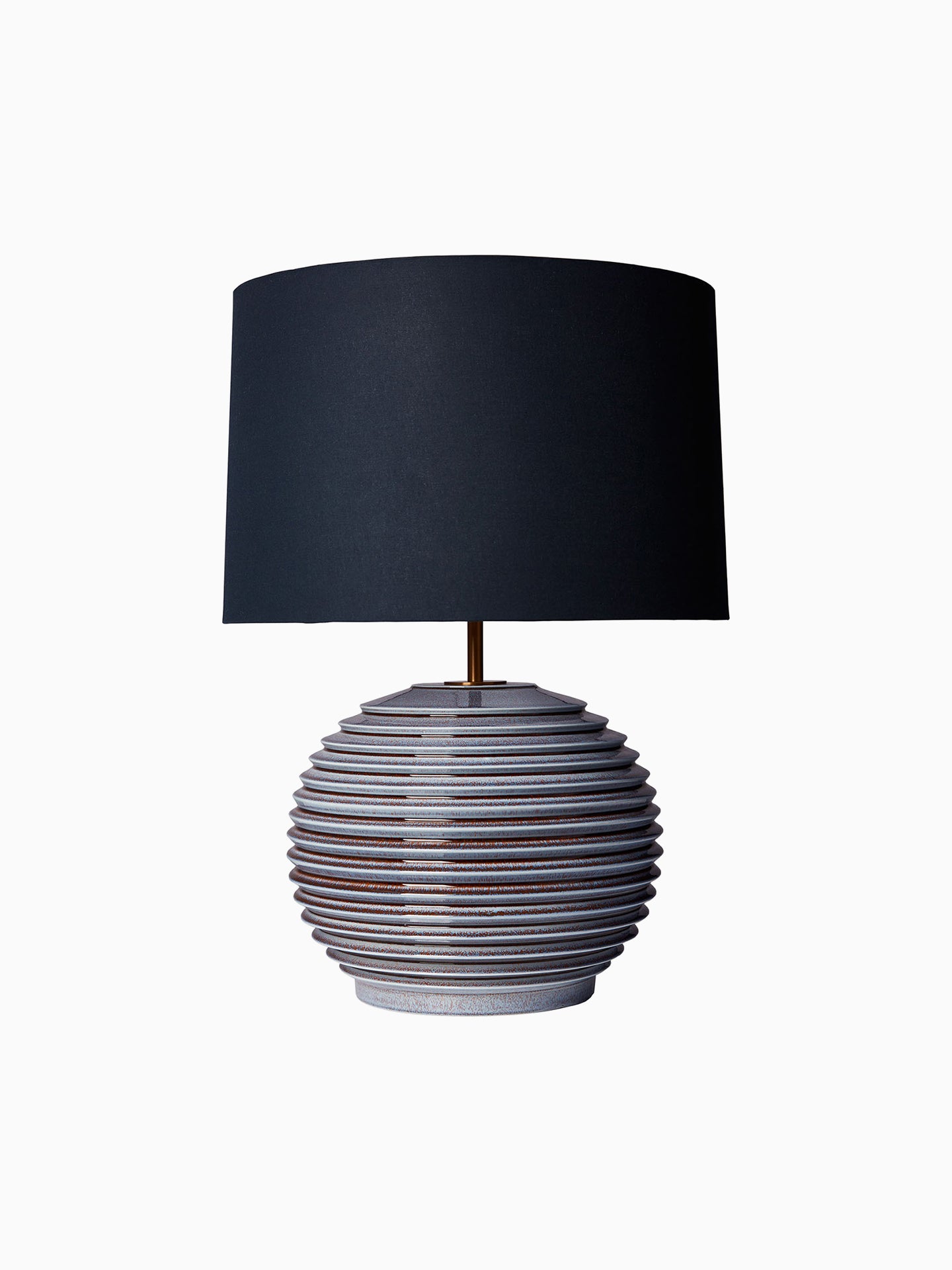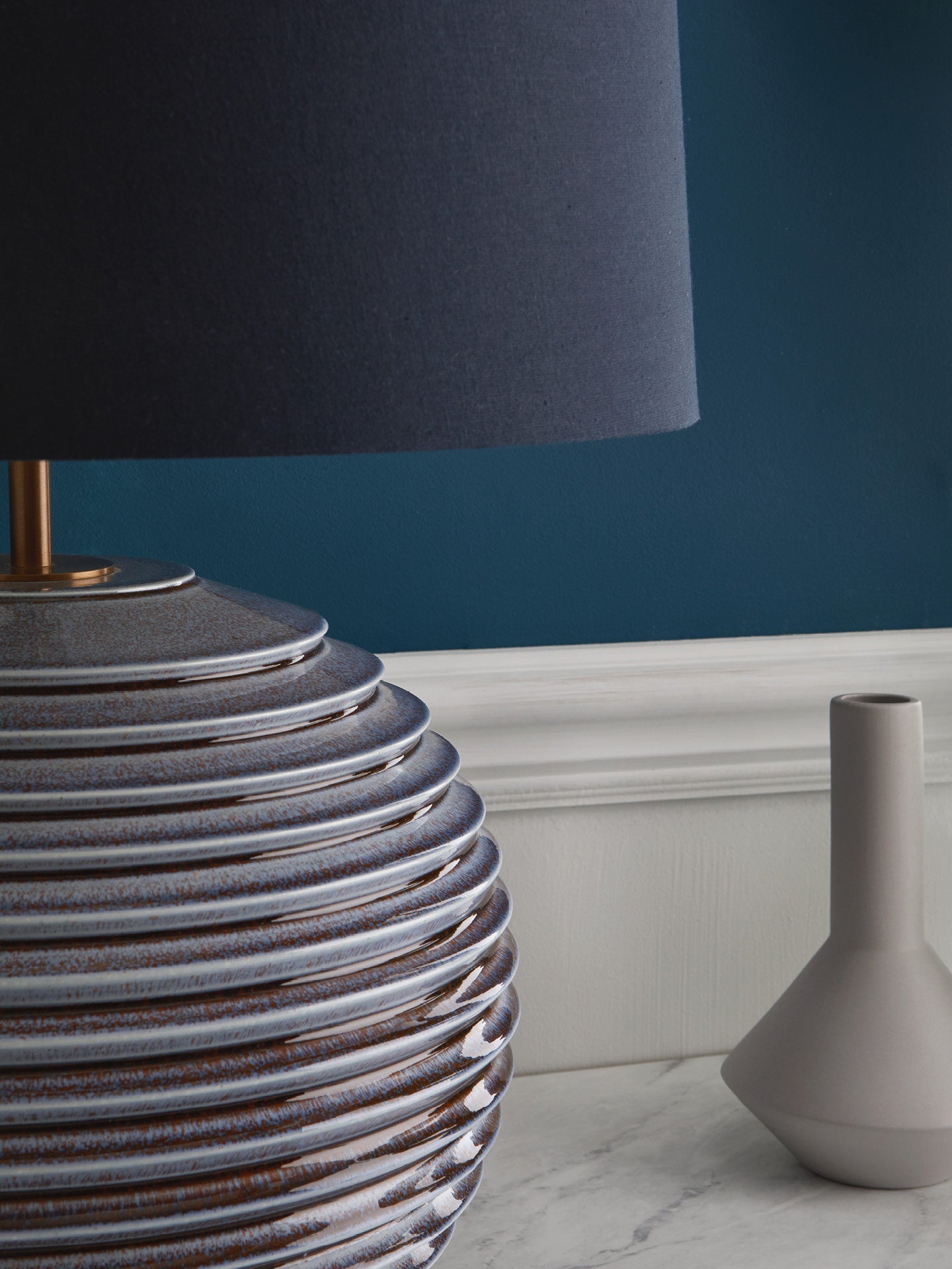 Our Venice table lamp echoes the fluid serenity of water ripples stretching outwards. This dynamic aesthetic cascades evenly down the height of the curved form, finished in a reactive glaze of aqua inspired tones.