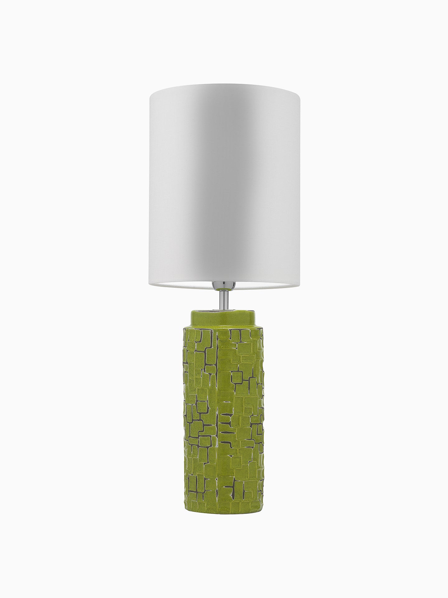 The Woodstock table lamp features a vibrant lime green ceramic base with an intricate, textured pattern.
